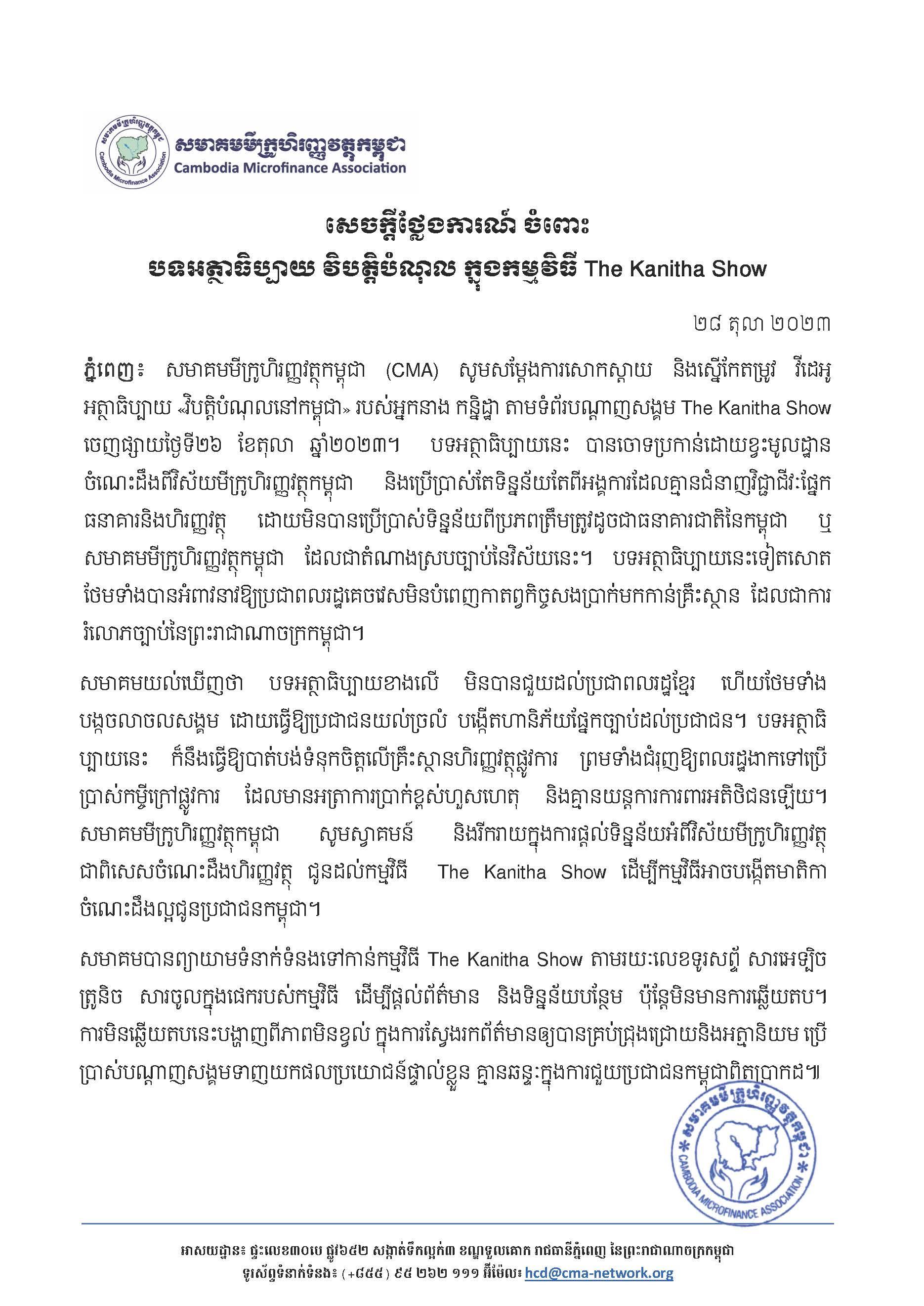 (ភ្នំពេញ)៖ សមាគមមីក្រូហិរញ្ញវត្ថុកម្ពុជា (CMA) បានសម្តែងការសោកស្តាយ និងស្នើឱ្យអ្នកនាង កន្និដ្ឋាស្នើកែតម្រូវ វីដេអូ ដែលអត្ថាធិប្បាយ «វិបត្តិបំណុលនៅកម្ពុជា» តាមទំព័របណ្តាញសង្គម The Kanitha Show ចេញផ្សាយថ្ងៃទី២៦ ខែតុលា ឆ្នាំ២០២៣។