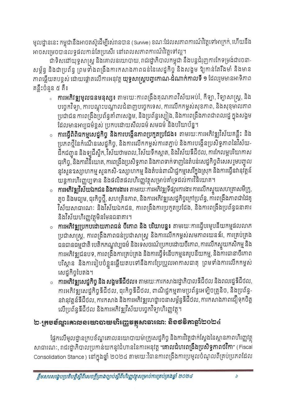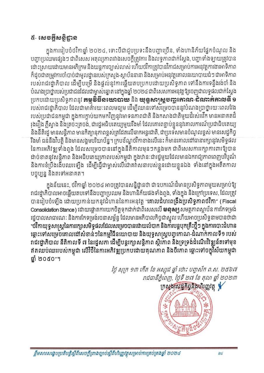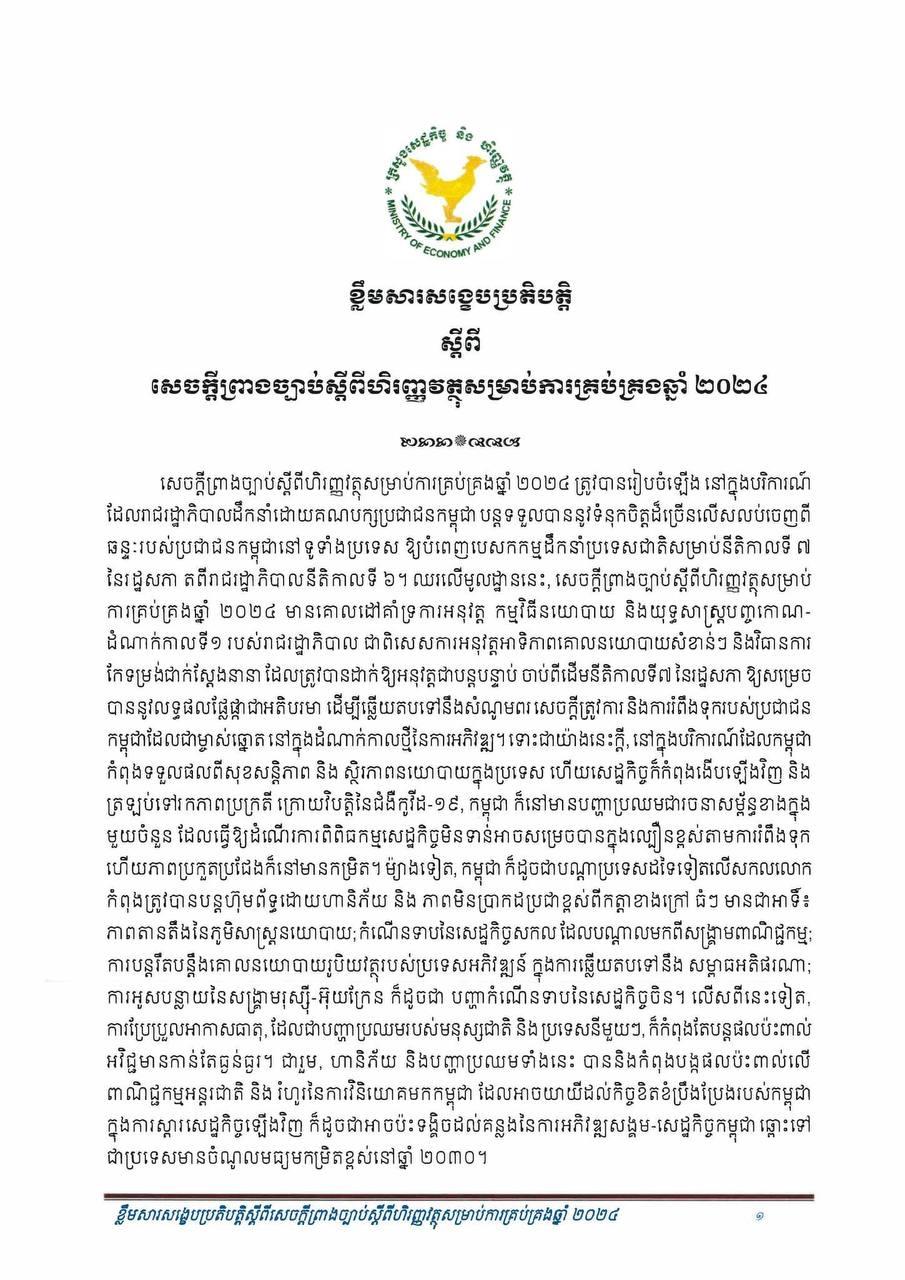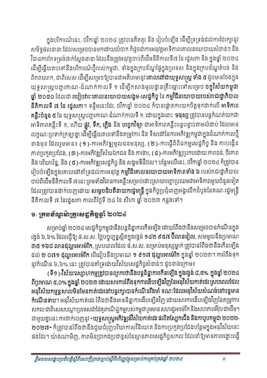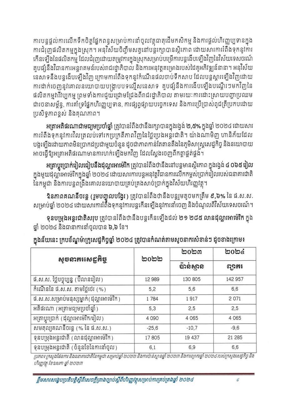 (ភ្នំពេញ)៖ សម្រាប់ឆ្នាំ២០២៤ សេដ្ឋកិច្ចកម្ពុជានឹងបន្តនិន្នាការកើនឡើង ដោយរំពឹងថាសម្រេចបានកំណើនក្នុងរង្វង់ ៦.៦% ដែលធ្វើឲ្យផលិតក្នុងស្រុកសរុប (ផ.ស.ស) ថ្លៃបច្ចុប្បន្នស្ថិតក្នុងរង្វង់ ១៤២ ៩៥៧ ប៊ីលានរៀល សមមូលនឹងប្រមាណ ៣៥ ១៦៨ លានដុល្លារ។ នេះបើតាមខ្លឹមសារសង្ខេបនៃសេចក្តីព្រាងច្បាប់ ស្តីពីហិរញ្ញវត្ថុសម្រាប់ការគ្រប់គ្រងឆ្នាំ ២០២៤ ដែលផ្សព្វផ្សាយដោយក្រសួងសេដ្ឋកិច្ច និងហិរញ្ញវត្ថុ។