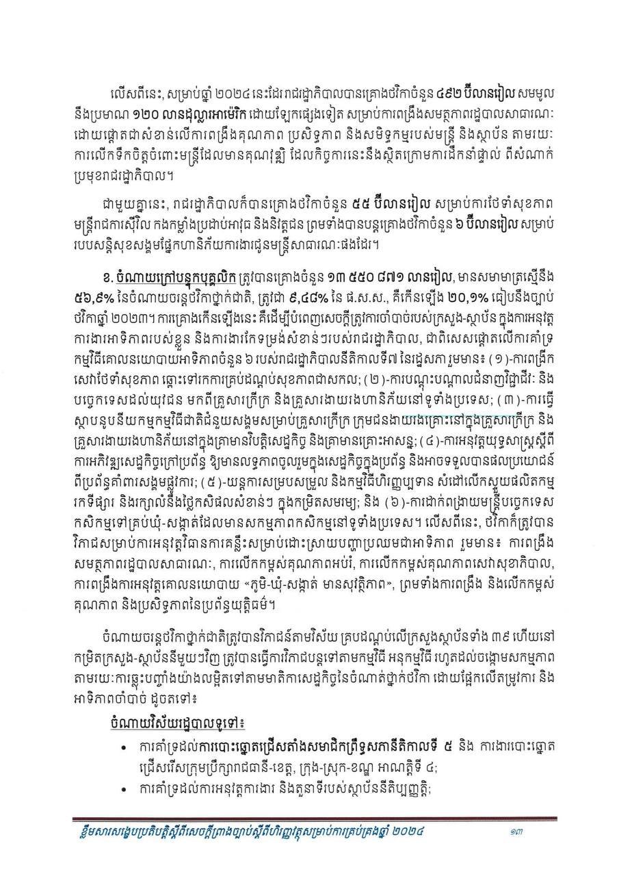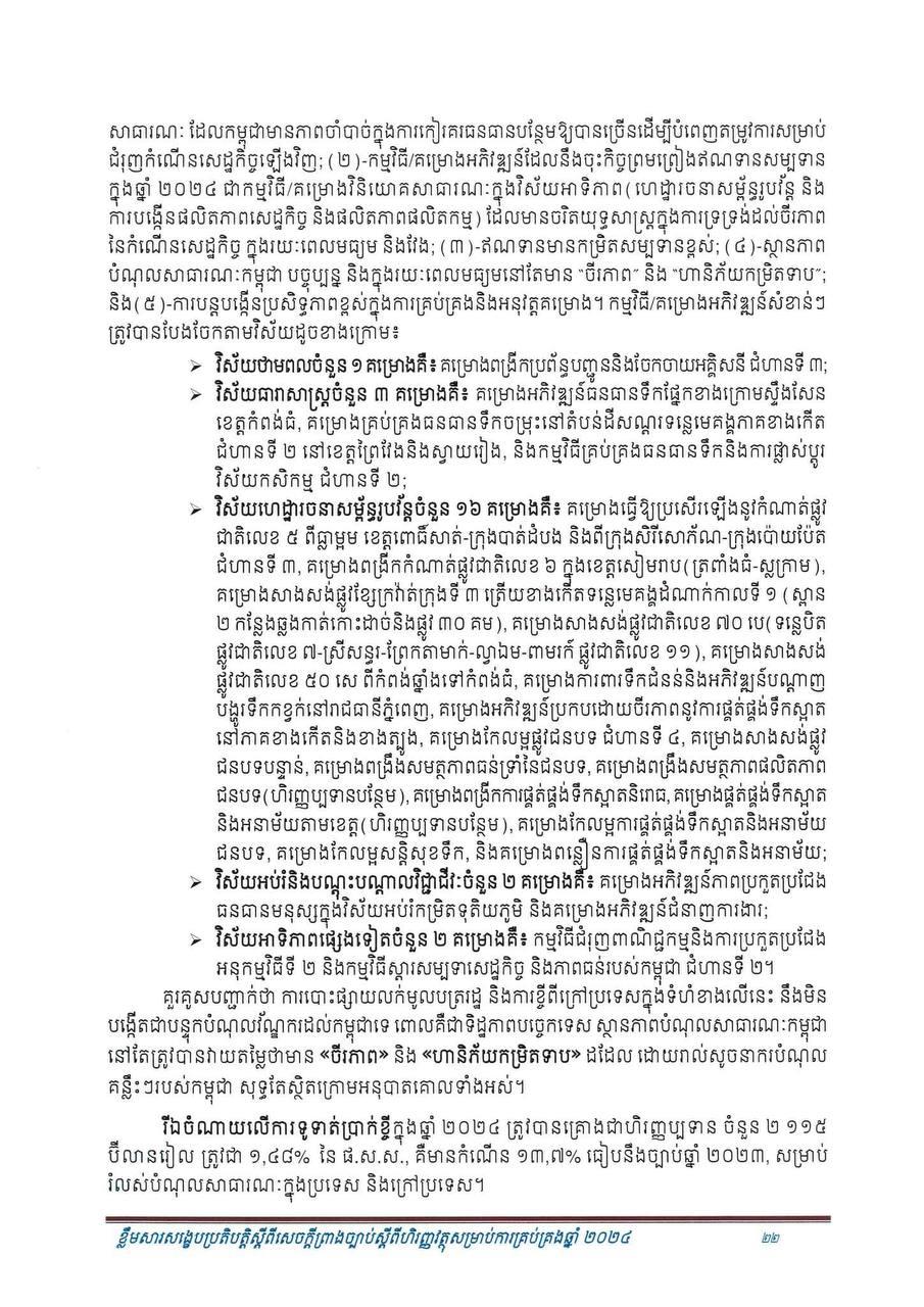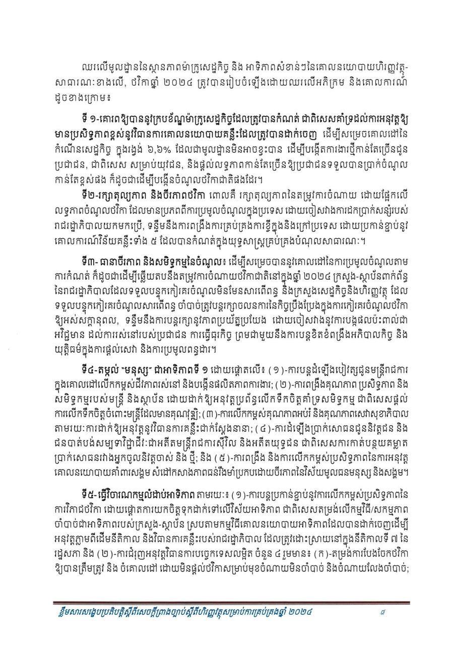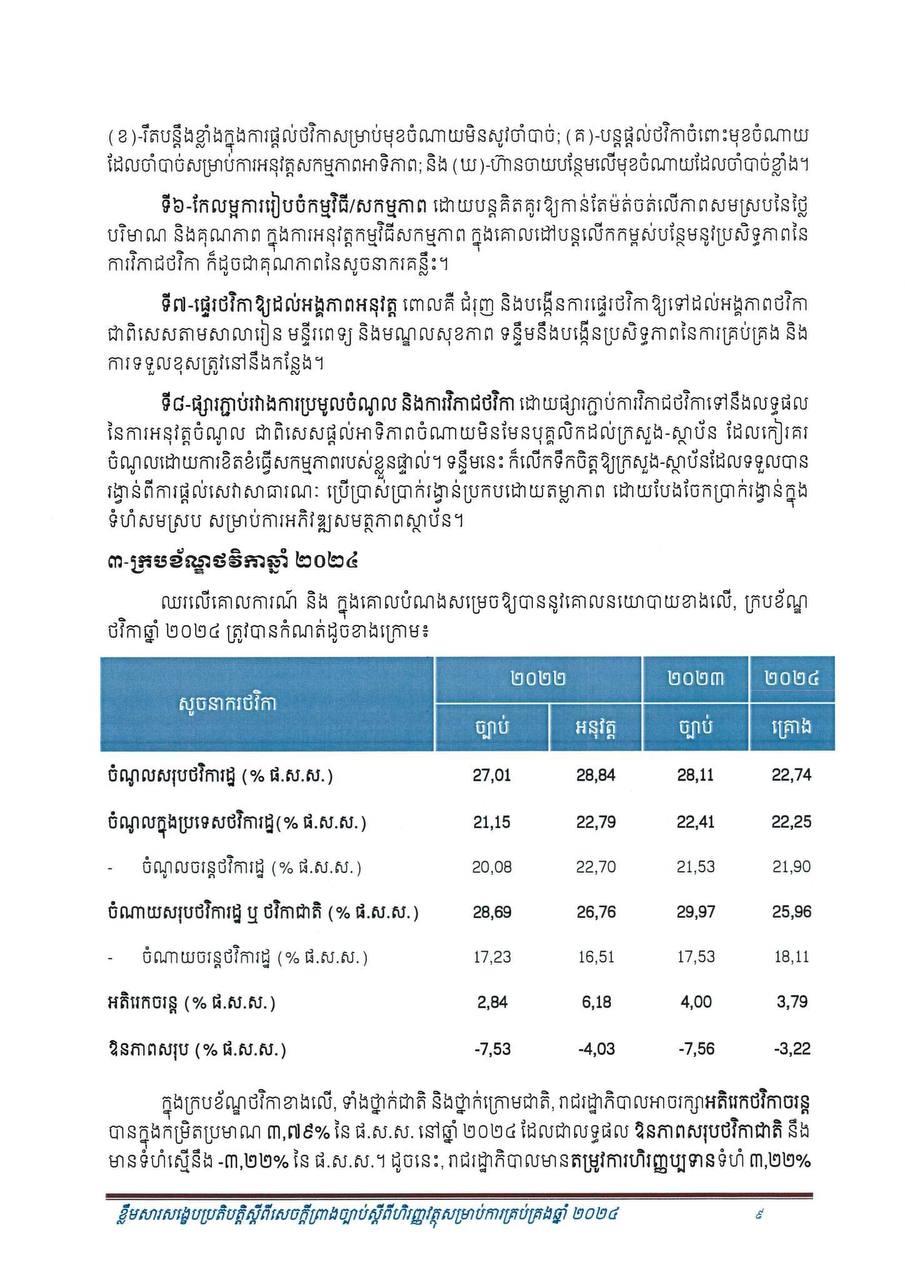 (ភ្នំពេញ)៖ សម្រាប់ឆ្នាំ២០២៤ សេដ្ឋកិច្ចកម្ពុជានឹងបន្តនិន្នាការកើនឡើង ដោយរំពឹងថាសម្រេចបានកំណើនក្នុងរង្វង់ ៦.៦% ដែលធ្វើឲ្យផលិតក្នុងស្រុកសរុប (ផ.ស.ស) ថ្លៃបច្ចុប្បន្នស្ថិតក្នុងរង្វង់ ១៤២ ៩៥៧ ប៊ីលានរៀល សមមូលនឹងប្រមាណ ៣៥ ១៦៨ លានដុល្លារ។ នេះបើតាមខ្លឹមសារសង្ខេបនៃសេចក្តីព្រាងច្បាប់ ស្តីពីហិរញ្ញវត្ថុសម្រាប់ការគ្រប់គ្រងឆ្នាំ ២០២៤ ដែលផ្សព្វផ្សាយដោយក្រសួងសេដ្ឋកិច្ច និងហិរញ្ញវត្ថុ។