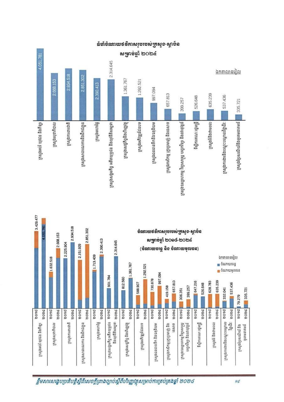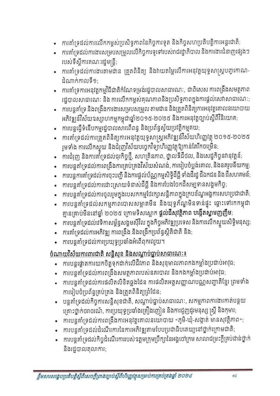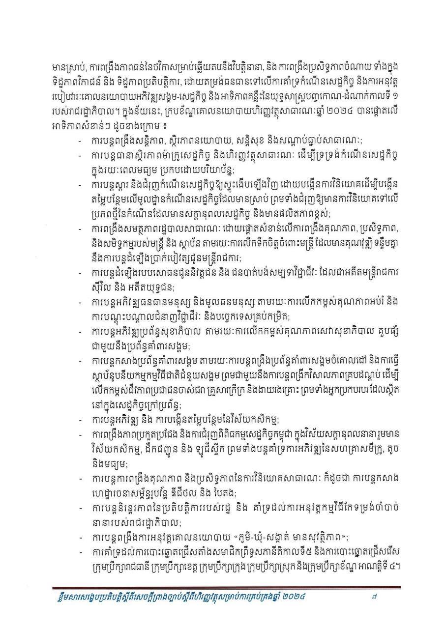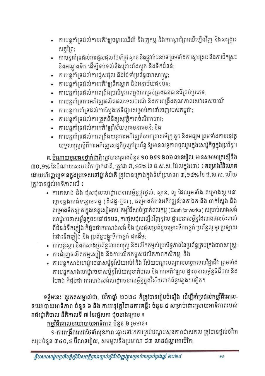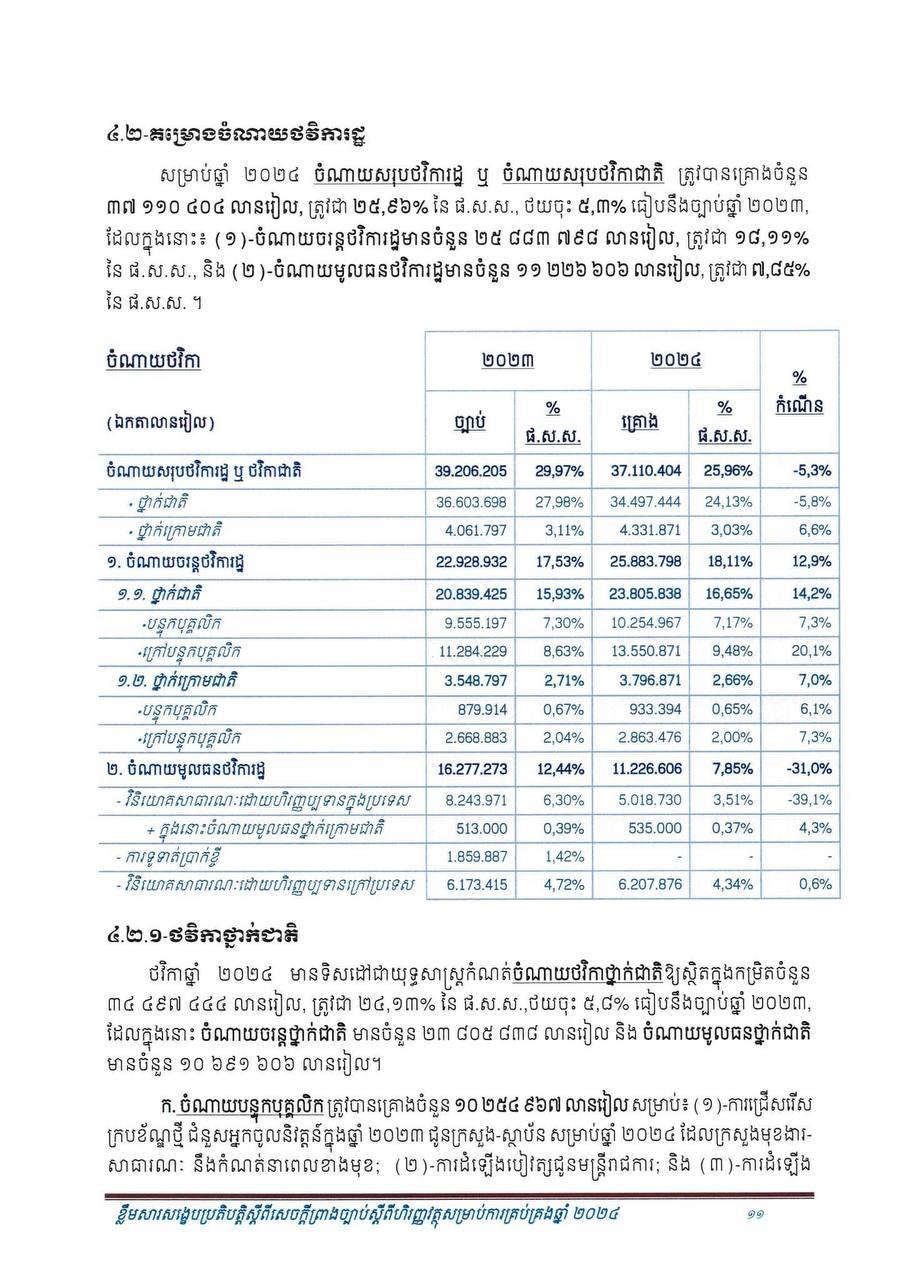 (ភ្នំពេញ)៖ សម្រាប់ឆ្នាំ២០២៤ សេដ្ឋកិច្ចកម្ពុជានឹងបន្តនិន្នាការកើនឡើង ដោយរំពឹងថាសម្រេចបានកំណើនក្នុងរង្វង់ ៦.៦% ដែលធ្វើឲ្យផលិតក្នុងស្រុកសរុប (ផ.ស.ស) ថ្លៃបច្ចុប្បន្នស្ថិតក្នុងរង្វង់ ១៤២ ៩៥៧ ប៊ីលានរៀល សមមូលនឹងប្រមាណ ៣៥ ១៦៨ លានដុល្លារ។ នេះបើតាមខ្លឹមសារសង្ខេបនៃសេចក្តីព្រាងច្បាប់ ស្តីពីហិរញ្ញវត្ថុសម្រាប់ការគ្រប់គ្រងឆ្នាំ ២០២៤ ដែលផ្សព្វផ្សាយដោយក្រសួងសេដ្ឋកិច្ច និងហិរញ្ញវត្ថុ។