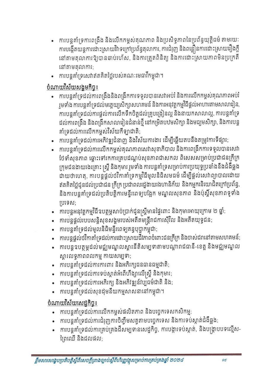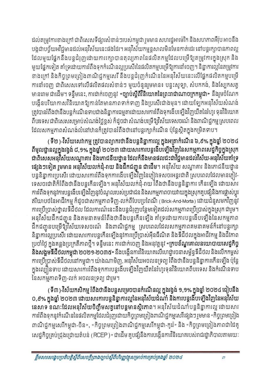 ទី៣៖ វិស័យកសិកម្មរំពឹងថា នឹងបន្តសម្រេចបានកំណើនល្អ ក្នុងរង្វង់ ១,១% ក្នុងឆ្នាំ ២០២៤ ធៀបនឹង ០,៩% ក្នុងឆ្នាំ ២០២៣ ដោយសារការបន្តនិន្នាការល្អនៃអនុវិស័យដំណាំ និងការបន្តងើបឡើងវិញនៃអនុវិស័យ នេសាទ ខណៈដែលអនុវិស័យចិញ្ចឹមសត្វនៅបន្តមានស្ថិរភាព។