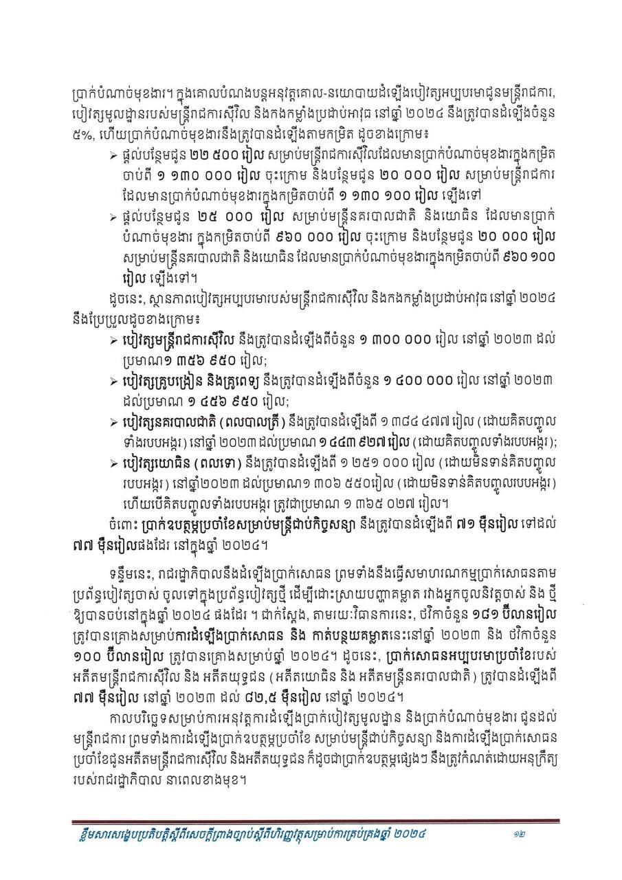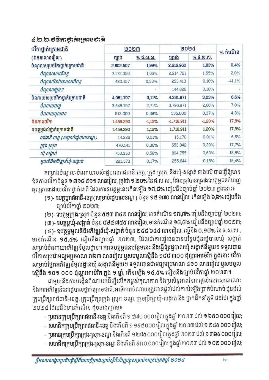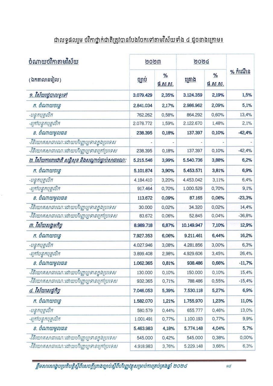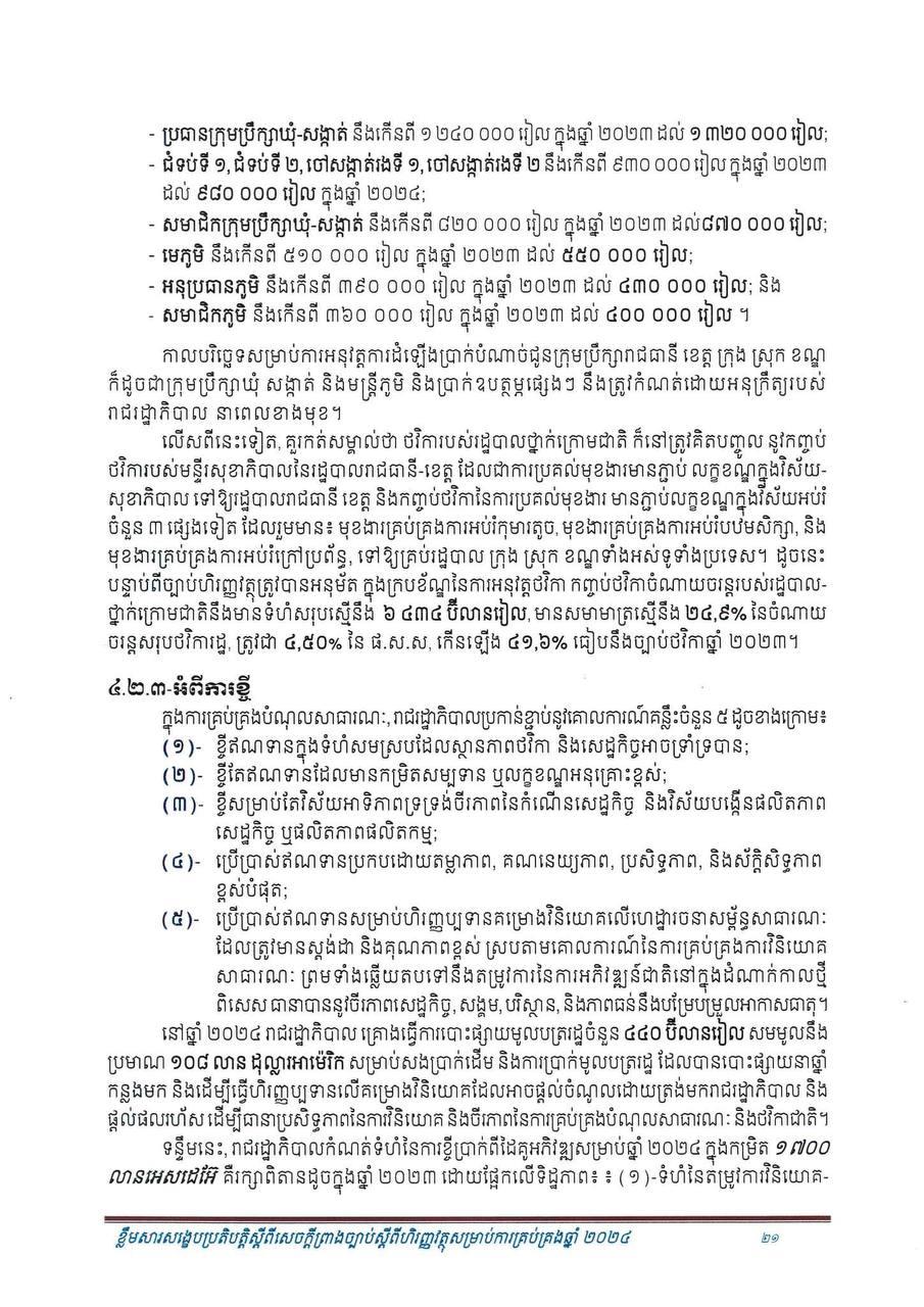 ឯកសារខ្លឹមសារសង្ខេបនៃសេចក្តីព្រាងច្បាប់បានបញ្ជាក់ទៀតថា ផ.ស.ស សម្រាប់មនុស្សម្នាក់ ត្រូវបានរំពឹងថានឹងកើនឡើងដល់ ២ ០៧១ ដុល្លារបើធៀបនឹងប្រមាណ ១ ៩១៧ ដុល្លារ ក្នុងឆ្នាំ២០២៣។ ការរំពឹងទុកនូវកំណើន ៦.៦% នេះ ត្រូវបានគាំទ្រដោយវិស័យសេដ្ឋកិច្ចសំខាន់ៗ ដូចខាងក្រោម៖