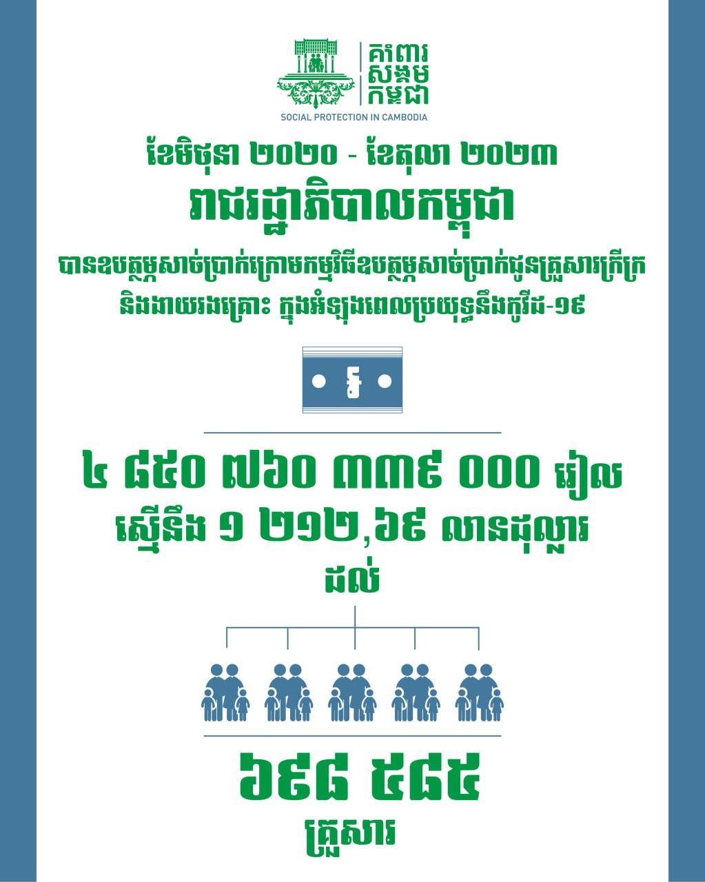 (ភ្នំពេញ)៖ ក្រុមប្រឹក្សាជាតិគាំពារសង្គម បានបញ្ជាក់ឱ្យដឹងថា គិតចាប់តាំងពីពេលដាក់ឱ្យអនុវត្តកាលពី ខែមិថុនា ឆ្នាំ២០២០ រហូតដល់ខែតុលា ឆ្នាំ២០២៣នេះ រាជរដ្ឋាភិបាលកម្ពុជាបានចំណាយទឹកប្រាក់ប្រមាណ ៤ ៨៥០ប៊ីលានរៀល ឬស្មើនឹង ១ ២១២,៦៩លានដុល្លារអាមេរិកហើយ សម្រាប់ឧបត្ថម្ភជូនពលរដ្ឋគោលដៅ តាមរយៈការអនុវត្តកម្មវិធីឧបត្ថម្ភសាច់ប្រាក់ជូនគ្រួសារក្រីក្រ និងងាយរងគ្រោះ ក្នុងអំឡុងពេលប្រយុទ្ធនឹងកូវីដ-១៩។