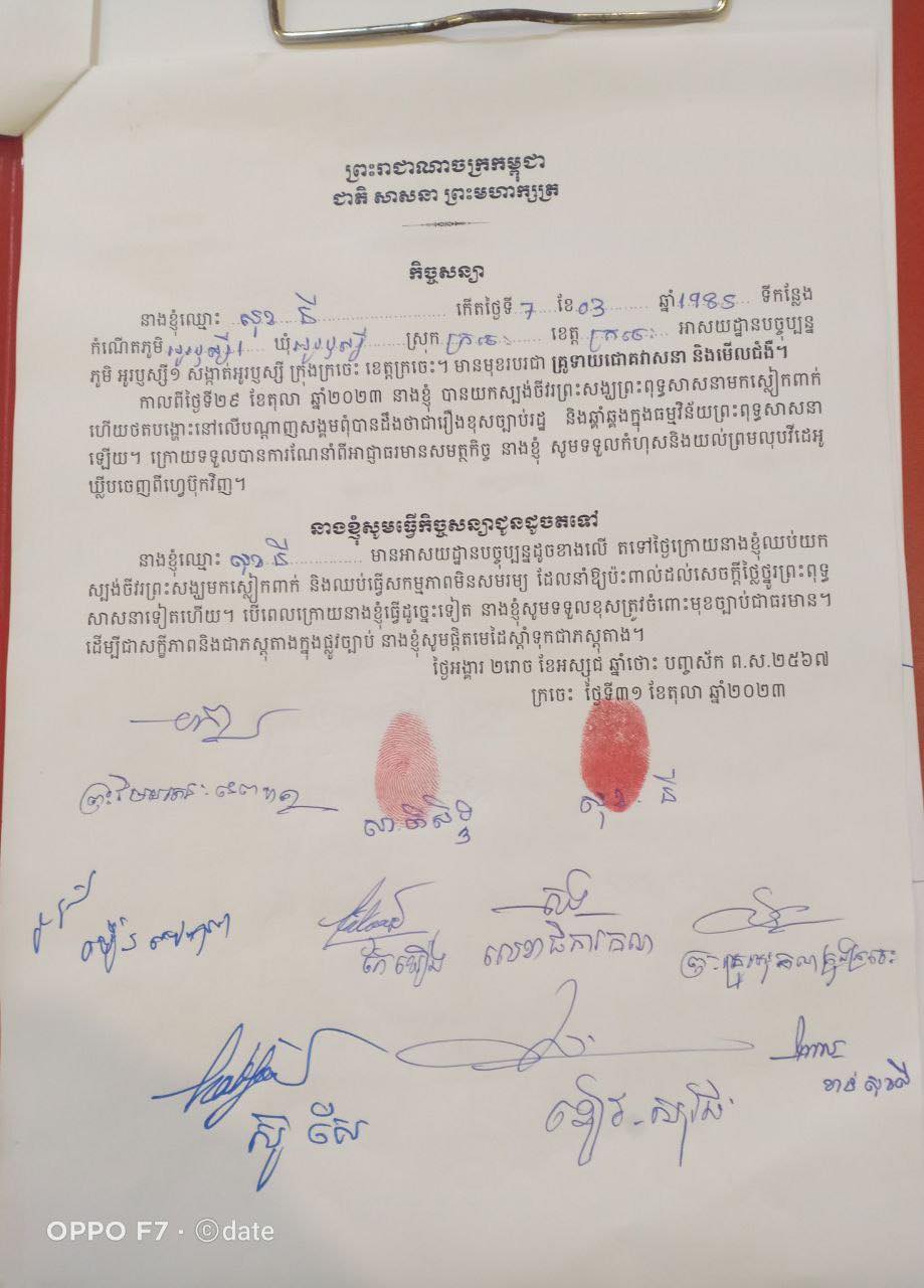 (ក្រចេះ)៖ អាជ្ញាធរក្រុងក្រចេះ រួមនឹងមន្ទីរធម្មការ និងសាសនាខេត្ត ព្រមទាំងព្រះមេគណខេត្ត នៅថ្ងៃទី៣១ ខែតុលា ឆ្នាំ២០២៣ បានចុះអប់រំស្រ្តីគ្រូទាយ មើលជោគវាសនា និងមើលជំងឺ នៅភូមិអូរឬស្សី សង្កាត់អូរឬស្សី ក្រុងក្រចេះ ក្រោយពីគ្រូទាយរូបនោះ បានយកស្បង់ចីវររបស់ព្រះសង្ឃ មកស្លៀកអង្គុយក្នុងចានផ្កាឈូកធ្វើដូចព្រះ រួចថតបង្ហោះក្នុងបណ្ដាញសង្គម កាលពីថ្ងៃទី២៩ ខែតុលា ឆ្នាំ២០២៣ ធ្វើឲ្យមហារជនរិះគន់ជាច្រើន។