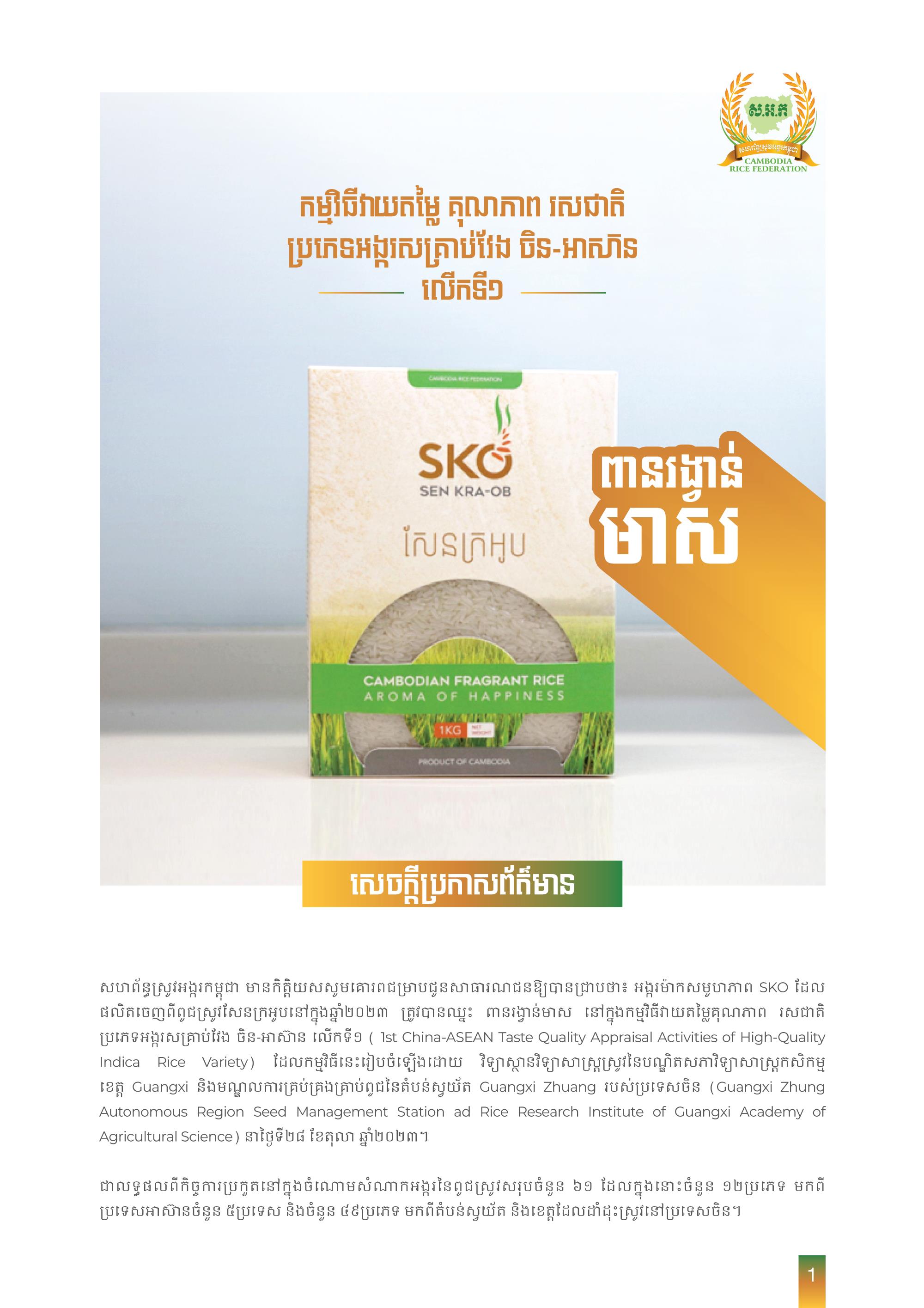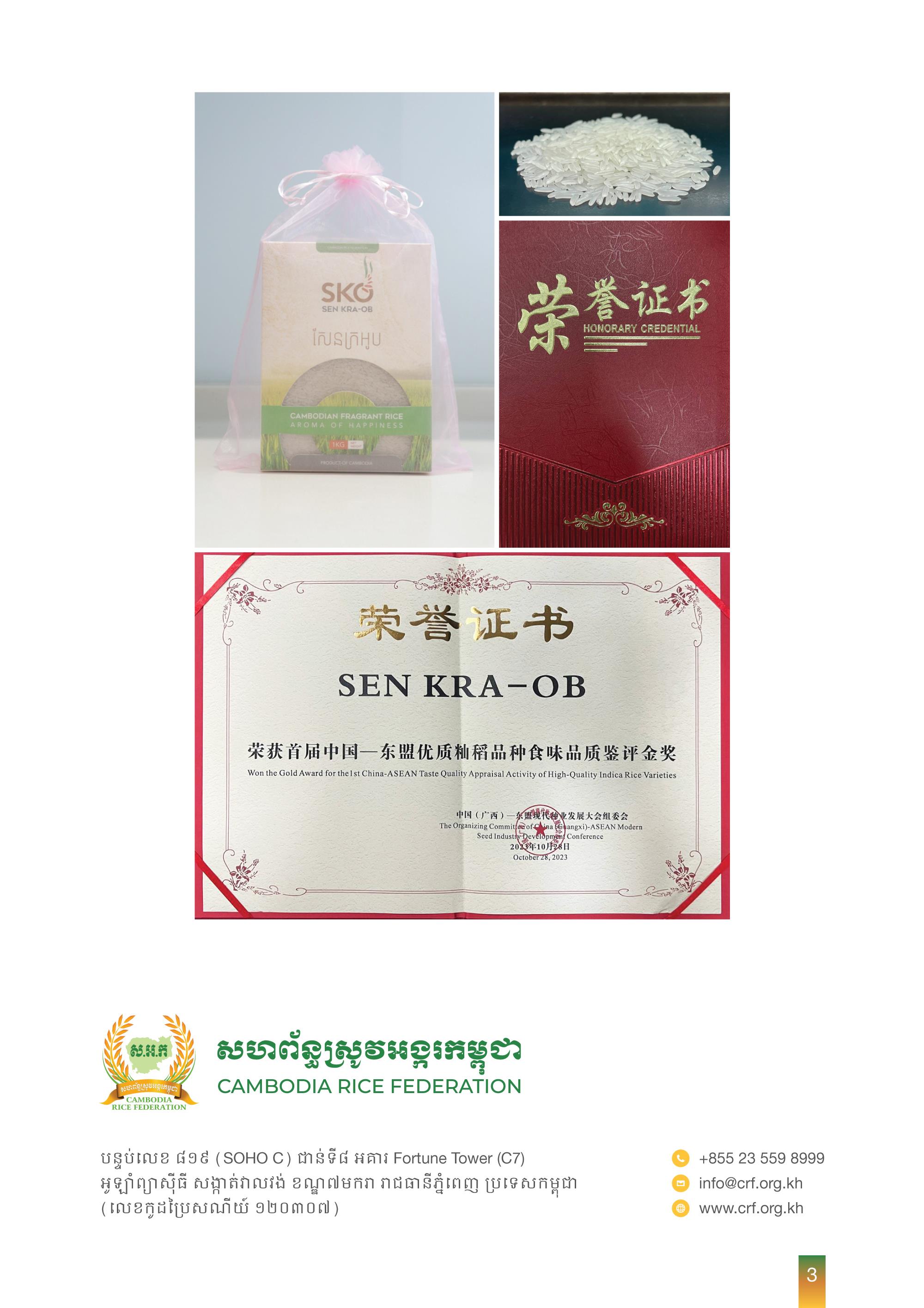 សូមជម្រាបថា អង្ករម៉ាកសមូហភាព SKO ដែលផលិតចេញពីពូជស្រូវសែនក្រអូបនៅក្នុងឆ្នាំ២០២៣ ត្រូវបានឈ្នះពានរង្វាន់មាស នៅក្នុងកម្មវិធីវាយតម្លៃគុណភាព រសជាតិប្រភេទអង្ករសគ្រាប់វែងចិន-អាស៊ាន លើកទី១ (1st China-ASEAN Taste Quality Appraisal Activities of High-Quality Indica Rice Variety)។