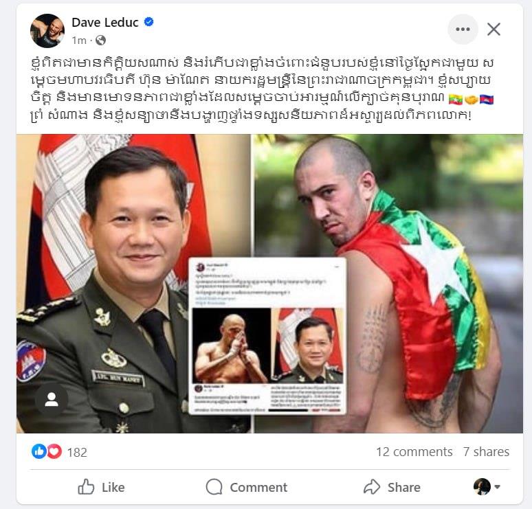 លោក ដាវ លីឌុច បានបង្ហោះសារលើហ្វេសប៊ុកជាខេមរភាសាយ៉ាងដូច្នេះថា «ខ្ញុំពិតជាមានកិត្តិយសណាស់ និងរំភើបជាខ្លាំងចំពោះជំនួបរបស់ខ្ញុំនៅថ្ងៃស្អែកជាមួយសម្តេចមហាបវរធិបតី ហ៊ុន ម៉ាណែត នាយករដ្ឋមន្ត្រីនៃព្រះរាជាណាចក្រកម្ពុជា។ ខ្ញុំសប្បាយចិត្ត និងមានមោទនភាពជាខ្លាំងដែលសម្តេចចាប់អារម្មណ៍លើក្បាច់គុនបុរាណមីយ៉ាន់ម៉ា-កម្ពុជា។ ព្រំ សំណាង និងខ្ញុំសន្យាថា នឹងបង្ហាញផ្ទាំងទស្សនីយភាពដ៏អស្ចារ្យដល់ពិភពលោក!»។