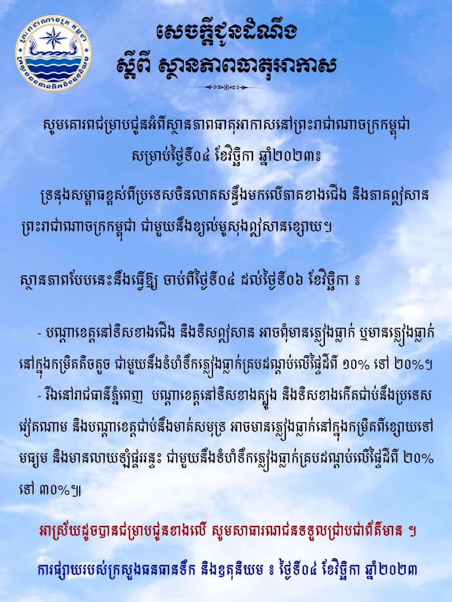 ក្រសួងធនធានទឹក ជូនដំណឹងពីស្ថានភាពធាតុអាកាសនៅកម្ពុជា សម្រាប់ថ្ងៃទី៤ ខែវិច្ឆិកា ឆ្នាំ២០២៣