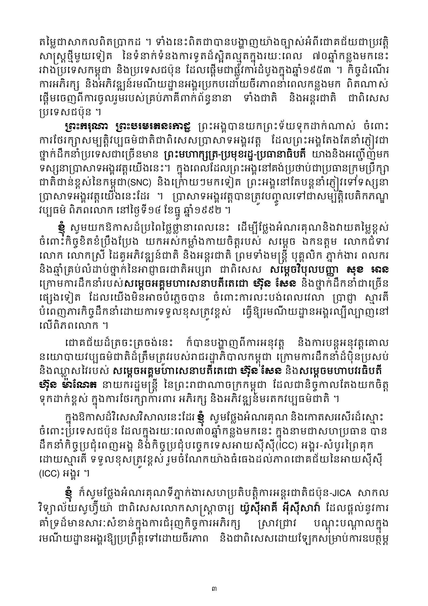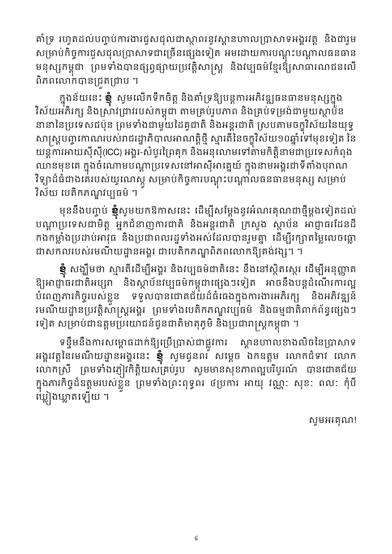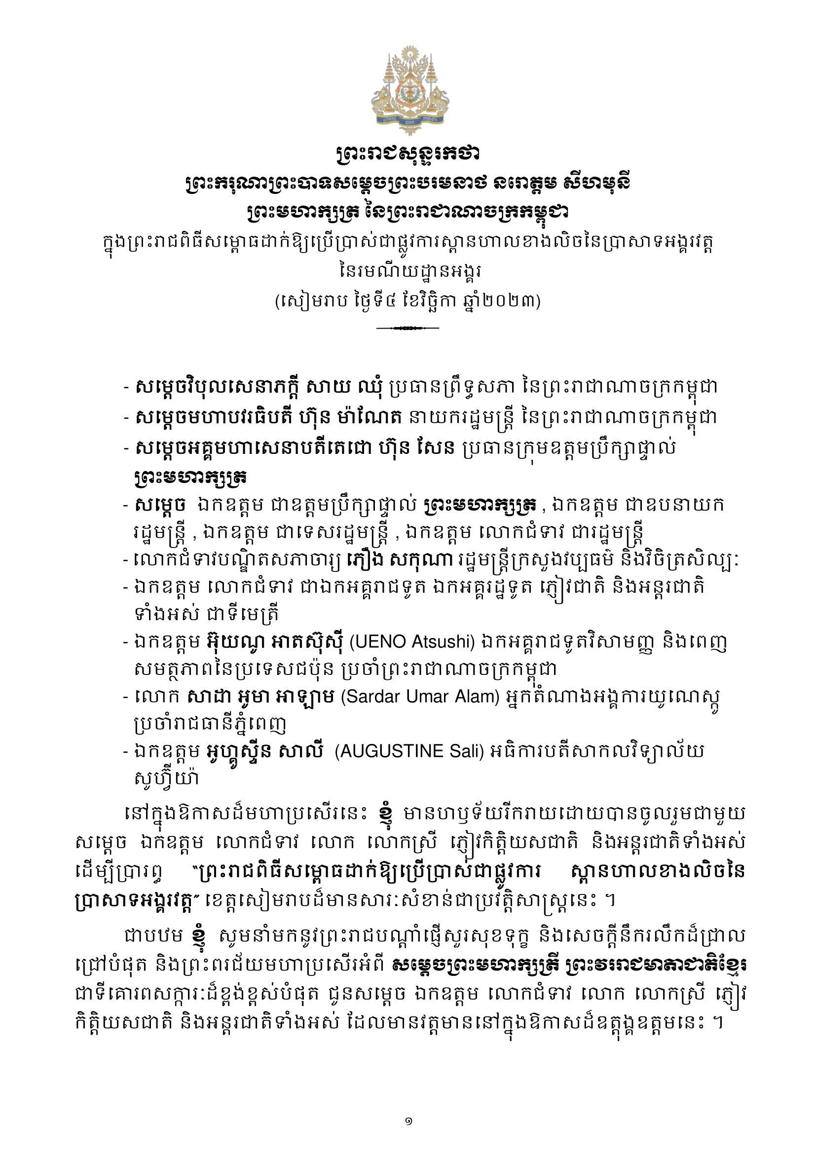 ព្រះមហាក្សត្របានយកឱកាសដ៏ប្រពៃថ្លៃថ្លានាពេលនេះ ថ្លែងអំណរគុណនិងវាយតម្លៃខ្ពស់ចំពោះកិច្ចខិតខំប្រឹងប្រែងយកអស់កម្លាំងកាយចិត្តរបស់សម្តេច ឯកឧត្តម លោកជំទាវ លោក លោកស្រី ដៃគូអភិវឌ្ឍន៍ជាតិ និងអន្តរជាតិ ព្រមទាំងមន្ត្រី បុគ្គលិក ភ្នាក់ងារ ពលករ និងឆ្មាំគ្រប់លំដាប់ថ្នាក់នៃអាជ្ញាធរជាតិអប្សរា ជាពិសេសសម្តេចវិបុលបញ្ញា សុខ អាន ក្រោមការដឹកនាំរបស់សម្តេចតេជោ ហ៊ុន សែន និងថ្នាក់ដឹកនាំជាច្រើនផ្សេងទៀត ដែលយើងមិនអាចបំភ្លេចបានចំពោះការលះបង់ពេលវេលា ប្រាជ្ញា ស្មារតីបំពេញភារកិច្ចដឹកនាំដោយការទទួលខុសត្រូវខ្ពស់ ធ្វើឱ្យរមណីយដ្ឋានអង្គរល្បីល្បាញនៅលើពិភពលោក។