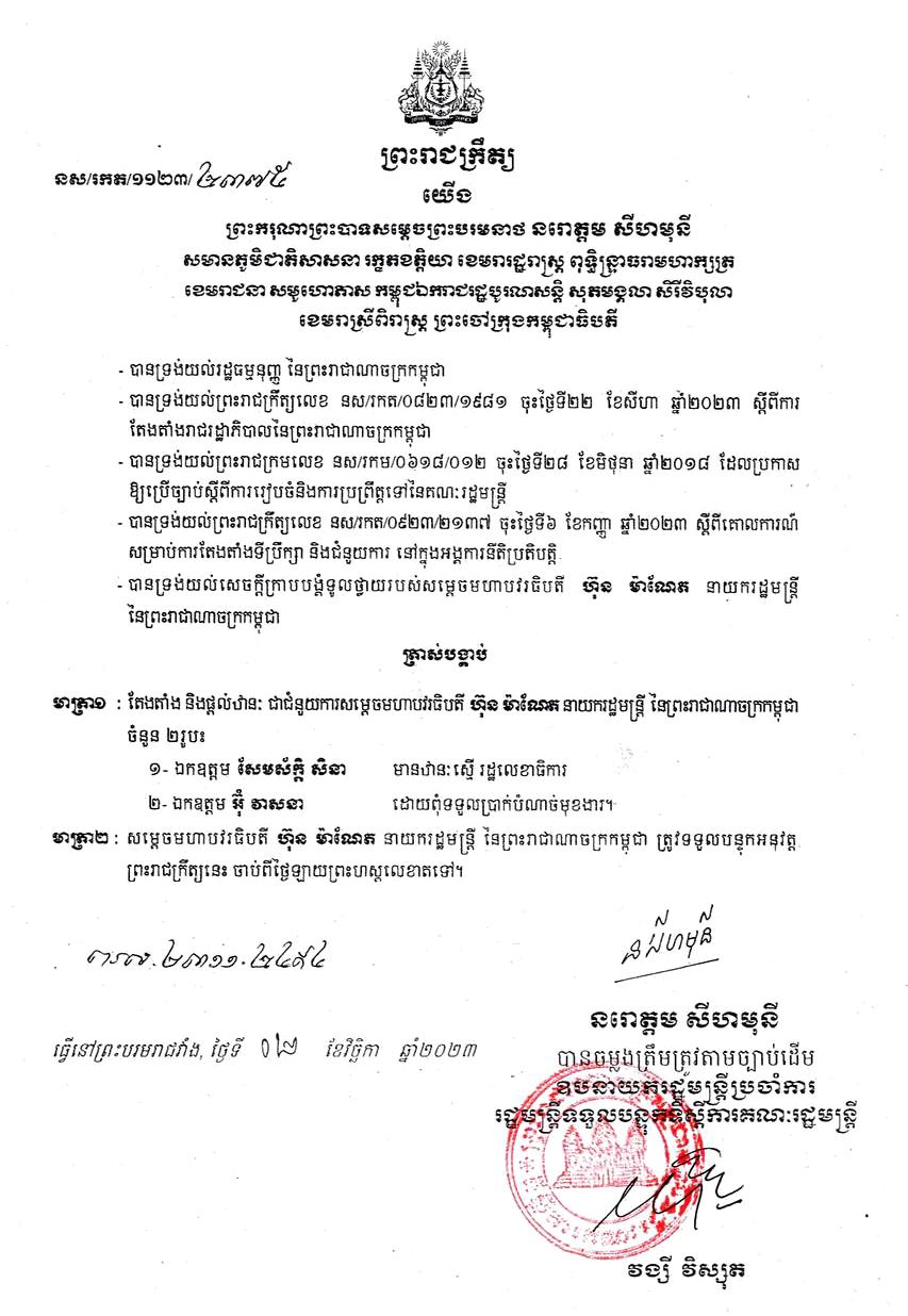 ក្នុងព្រះរាជក្រឹត្យដែលបណ្ដាញព័ត៌មាន Fresh News ទទួលបាននៅព្រឹកថ្ងៃទី០៨ ខែវិច្ឆិកា ឆ្នាំ២០២៣នេះ បានឲ្យដឹងថា ត្រូវបានតែងតាំង និងផ្ដល់ឋានៈជំនួយការ រួមមាន៖