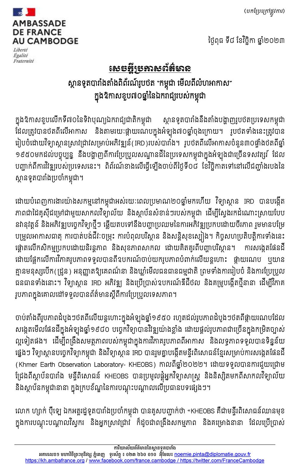 ស្ថានទូតបារាំងតាំងពិព័រណ៍រូបថត «កម្ពុជា មើលពីលំហអាកាស» ក្នុងឱកាសខួប៧០ឆ្នាំនៃឯករាជ្យរបស់កម្ពុជា