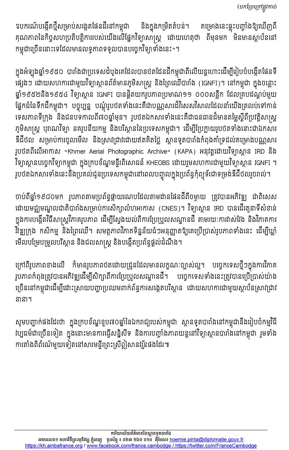 រូបថតពីលើអាកាសចំនួន៣០ផ្ទាំង ថតពីឆ្នាំ១៩៥០មកដល់បច្ចុប្បន្ន នឹងបង្ហាញពីការប្រែប្រួលសណ្ឋានដីនៃប្រទេសកម្ពុជាក្នុងអំឡុងជាច្រើនទសវត្សរ៍ ដែលបញ្ជាក់ពីការវិវឌ្ឍរបស់ប្រទេសនេះ។ ពិព័រណ៍ខាងលើធ្វើឡើងចាប់ពីថ្ងៃទី០៨ ខែវិច្ឆិកាតទៅ នៅលើជញ្ជាំងរបងនៃស្ថានទូតបារាំងប្រចាំកម្ពុជា។