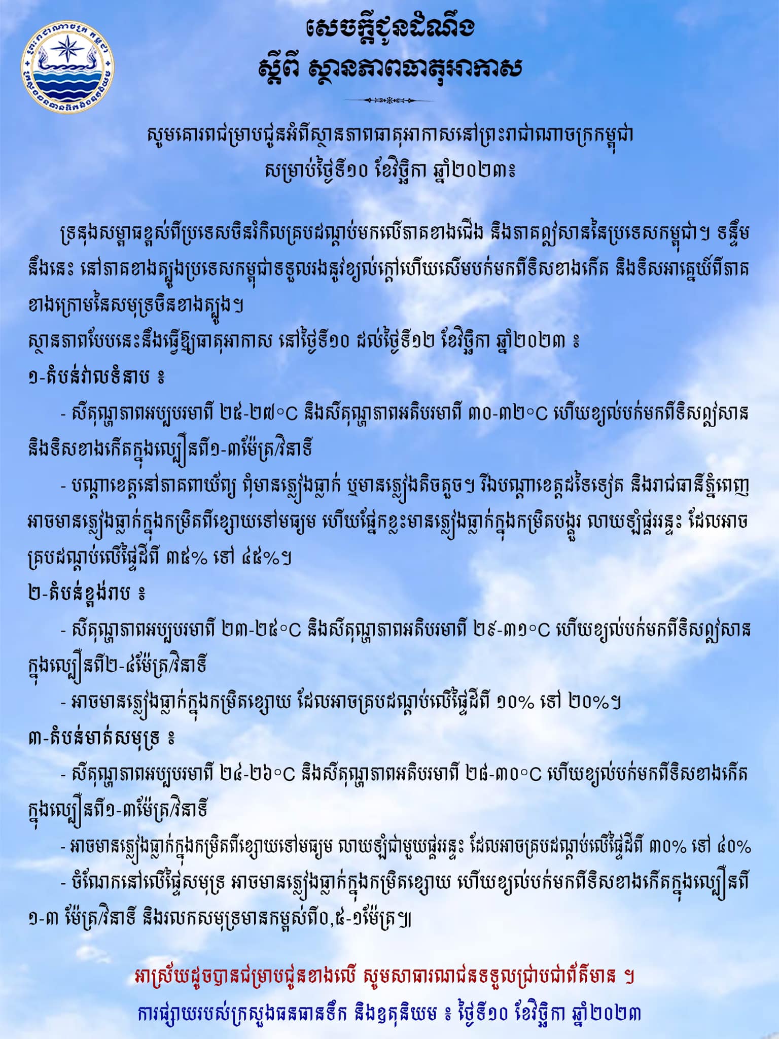 ក្រសួងធនធានទឹក ជូនដំណឹងពីស្ថានភាពធាតុអាកាស នៅព្រះរាជាណាចក្រកម្ពុជា សម្រាប់ថ្ងៃទី១០ ខែវិច្ឆិកា ឆ្នាំ២០២៣
