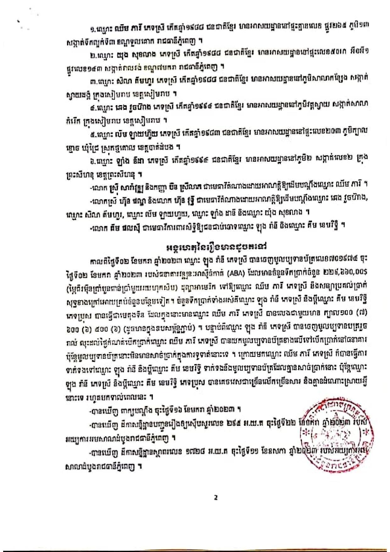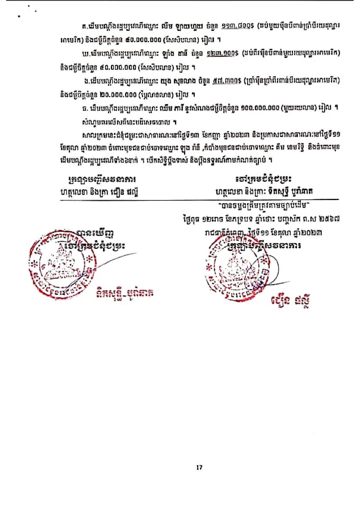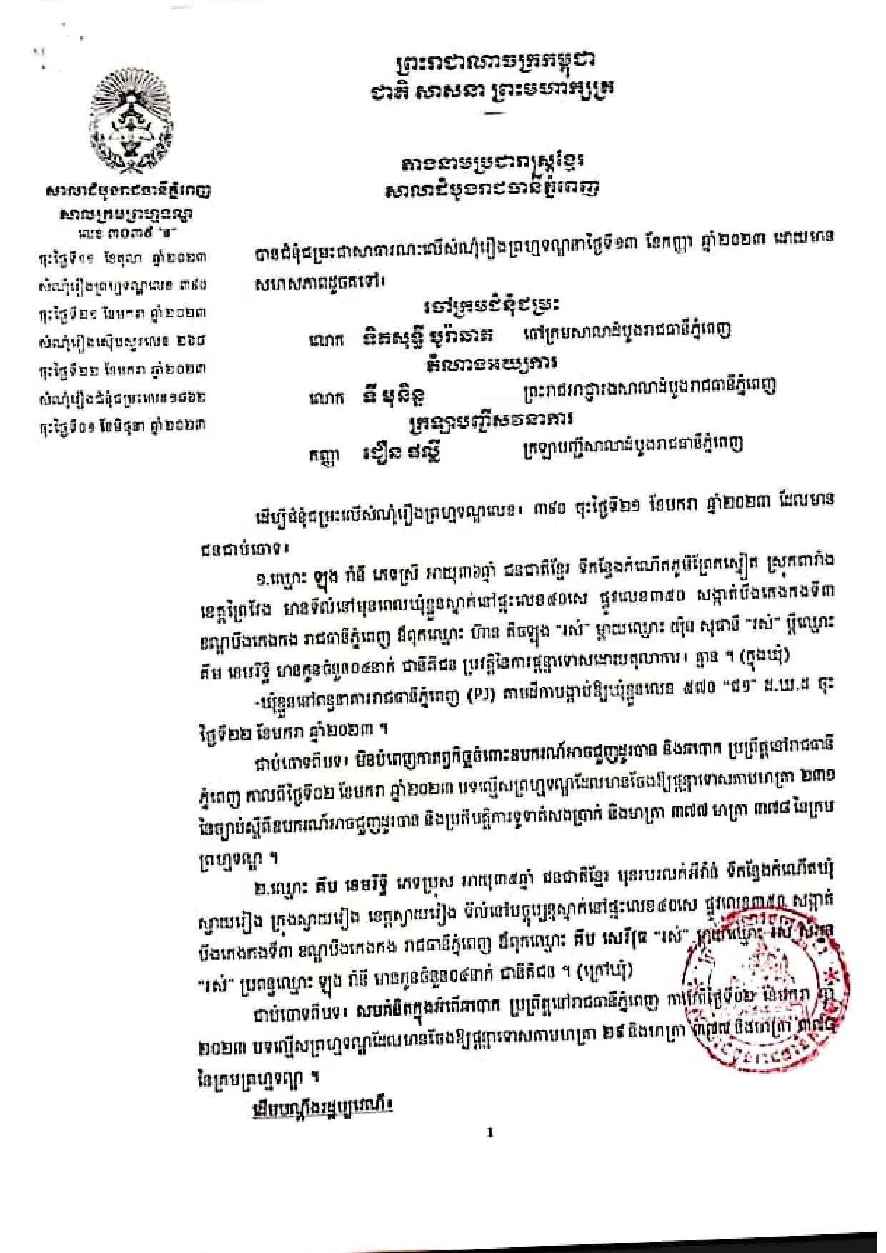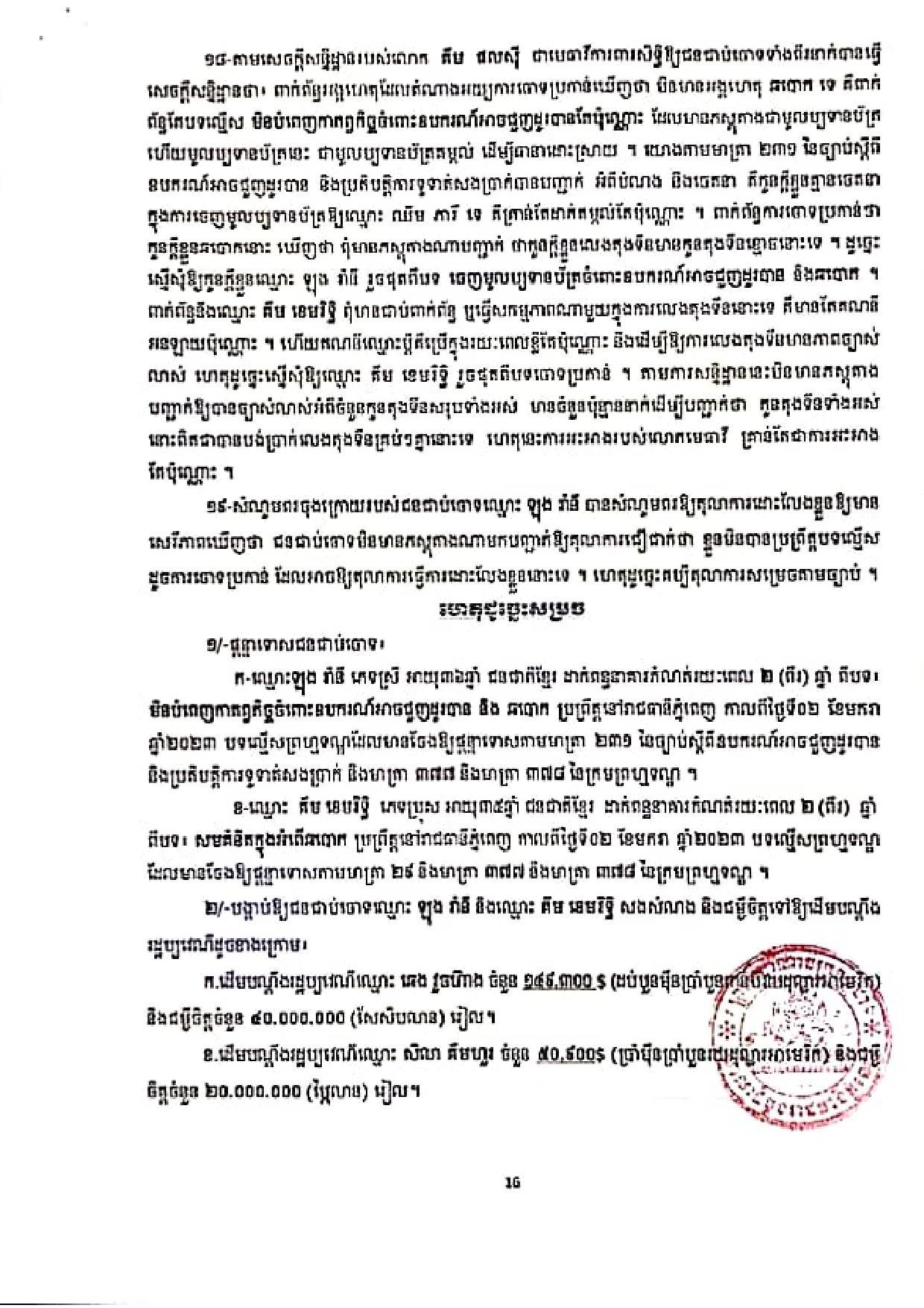 នេះបើយោងតាមសាលក្រមដែលបណ្តាញព័ត៌មាន Fresh News ទទួលបាននៅ ថ្ងៃទី១៥ ខែវិច្ឆិកា ឆ្នាំ២០២៣។ យោងតាមសាលាក្រមសម្រេចដាក់ពន្ធនាគារក្នុងម្នាក់ៗ រយៈពេល ២ឆ្នាំ ពីបទ មិនបំពេញកាតព្វកិច្ចចំពោះឧបករណ៍អាចជួញដូរបាន និងឆបោក និង សមគំនិតក្នុងអំពើឆបោក។