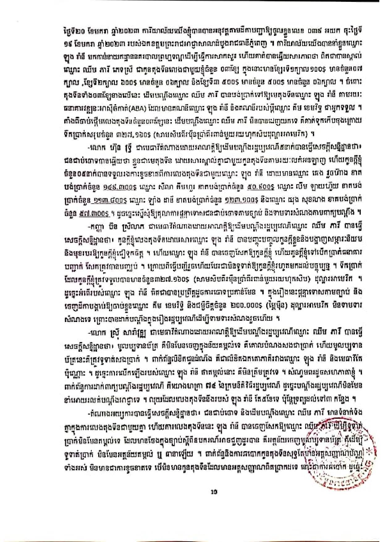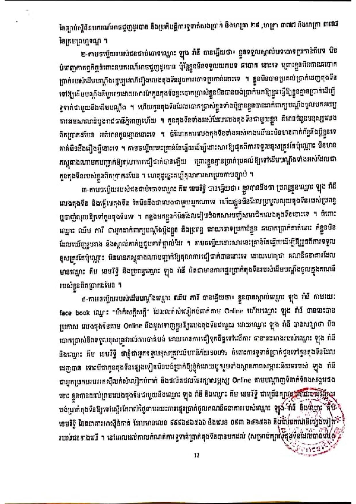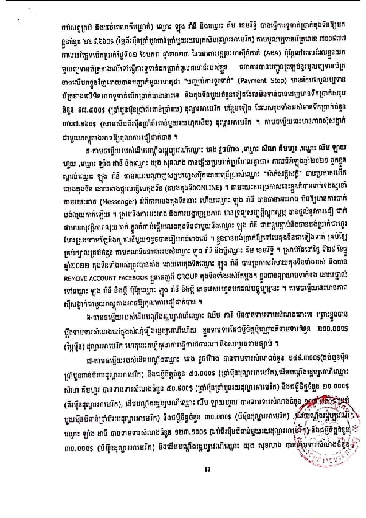 នេះបើយោងតាមសាលក្រមដែលបណ្តាញព័ត៌មាន Fresh News ទទួលបាននៅ ថ្ងៃទី១៥ ខែវិច្ឆិកា ឆ្នាំ២០២៣។ យោងតាមសាលាក្រមសម្រេចដាក់ពន្ធនាគារក្នុងម្នាក់ៗ រយៈពេល ២ឆ្នាំ ពីបទ មិនបំពេញកាតព្វកិច្ចចំពោះឧបករណ៍អាចជួញដូរបាន និងឆបោក និង សមគំនិតក្នុងអំពើឆបោក។