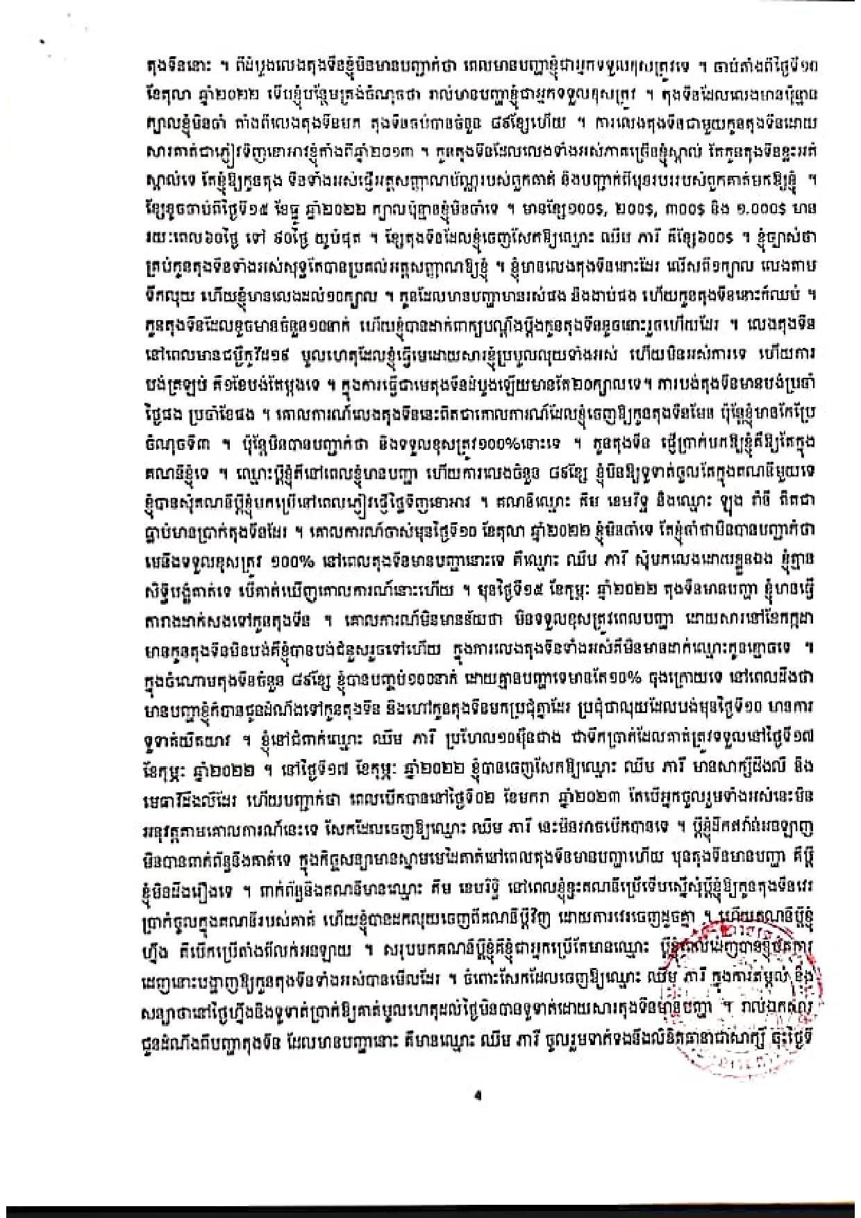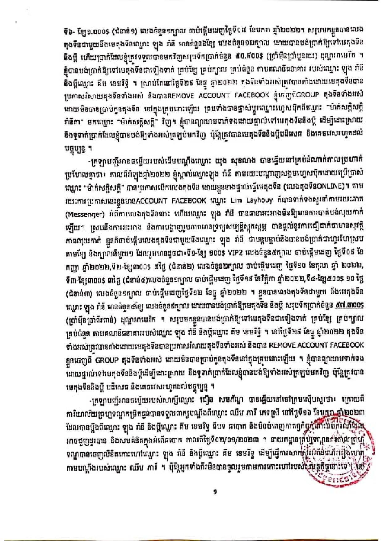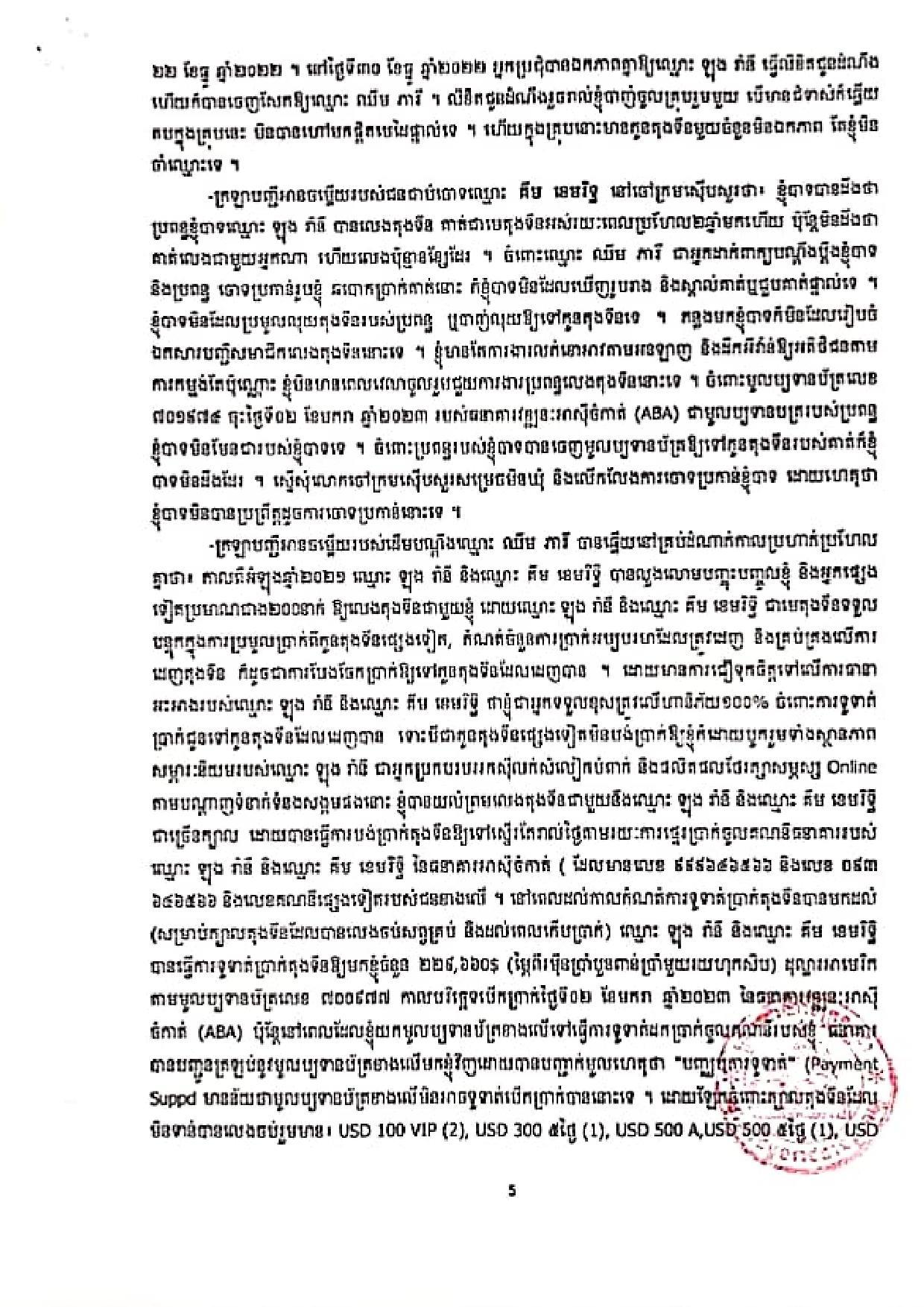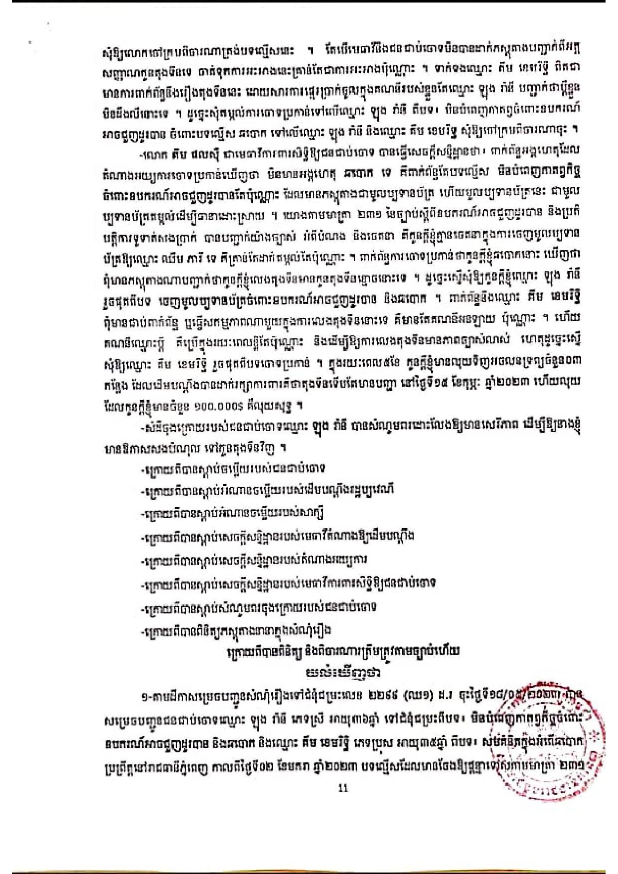 នេះបើយោងតាមសាលក្រមដែលបណ្តាញព័ត៌មាន Fresh News ទទួលបាននៅ ថ្ងៃទី១៥ ខែវិច្ឆិកា ឆ្នាំ២០២៣។ យោងតាមសាលាក្រមសម្រេចដាក់ពន្ធនាគារក្នុងម្នាក់ៗ រយៈពេល ២ឆ្នាំ ពីបទ មិនបំពេញកាតព្វកិច្ចចំពោះឧបករណ៍អាចជួញដូរបាន និងឆបោក និង សមគំនិតក្នុងអំពើឆបោក។