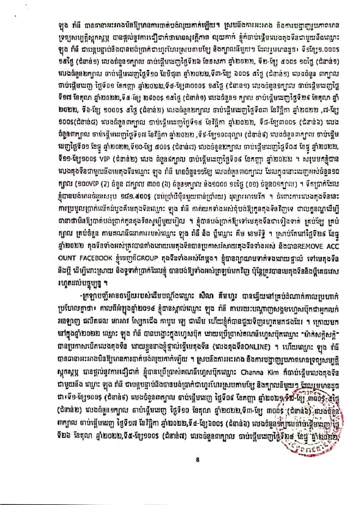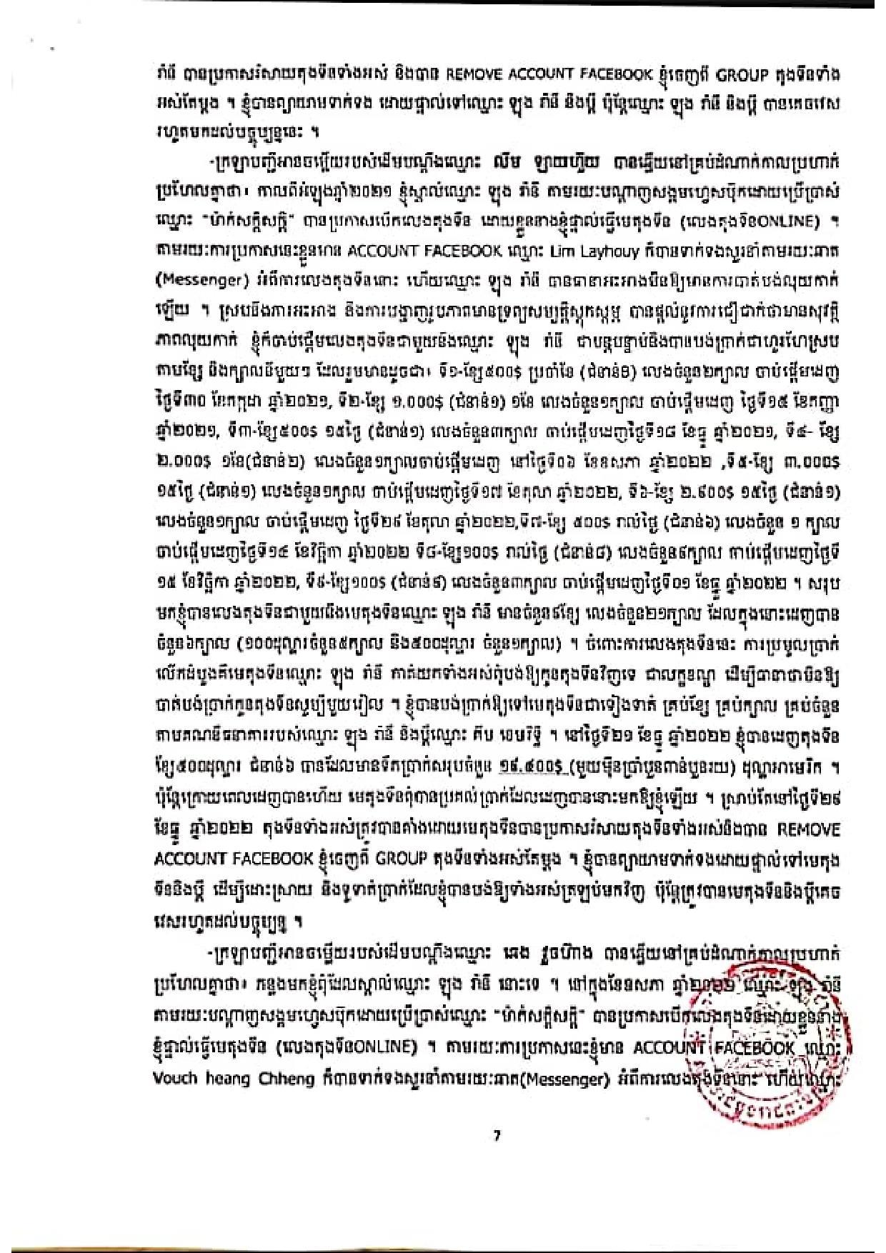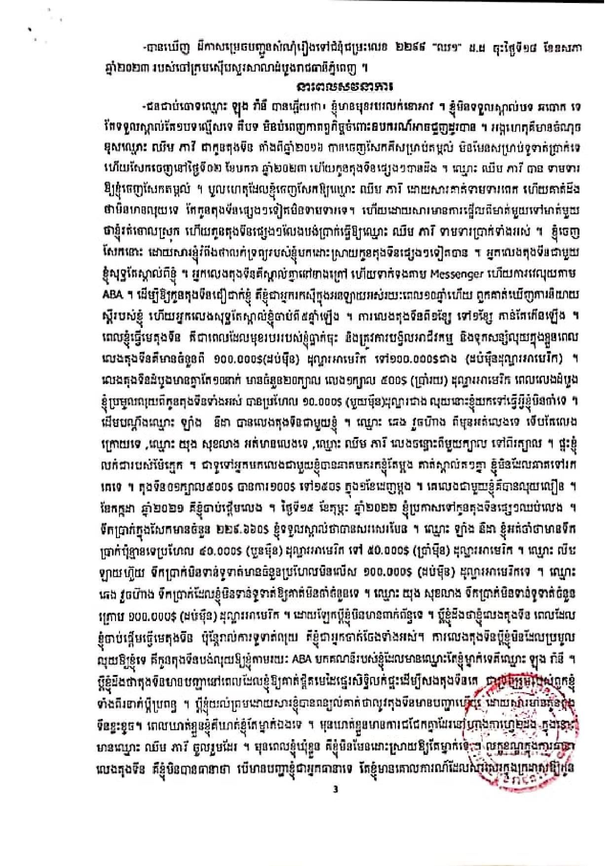 យោងតាមពាក្យបណ្តឹងរបស់ជនរងគ្រោះបានប្តឹងឈ្មោះ ឡុង រ៉ានី និងប្តី ជាមេតុងទីនបានលេងជាមួយគ្នា មានក្បាលតុងទីនផ្តាច់ខ្សែ ១០០(៧) ៦០០(៦) ៥០០(៦)(ដូចមានក្នុងឧបសម្ពន្ធភ្ជាប់) ដោយដើមបណ្តឹងជាកូនតុងទីនបានបង់គ្រប់ចំនួន និងដល់ពេលត្រូវកើបប្រាក់តុងទីនទាំងអស់វិញ សរុប៣២៧,១៦០ដុល្លារអាមេរិកពីមេតុងទីនឈ្មោះ ឡុង រ៉ានី និងប្តី ទើបពួកគាត់ចេញជាមូលប្បទានប័ត្រមួយសន្លឹកចុះថ្ងៃទី២ ខែមករា ឆ្នាំ២០២៣ របស់ធនាគារវឌ្ឍនៈអាស៊ីចំកាត់ ដែលមានទឹកប្រាក់ចំនួន២២៩,៦៦០ដុល្លារអាមេរិក និងសន្យាប្រគល់ប្រាក់សុទ្ធខាងក្រៅឲ្យបានគ្រប់ចំនួនបន្ថែមទៀត។