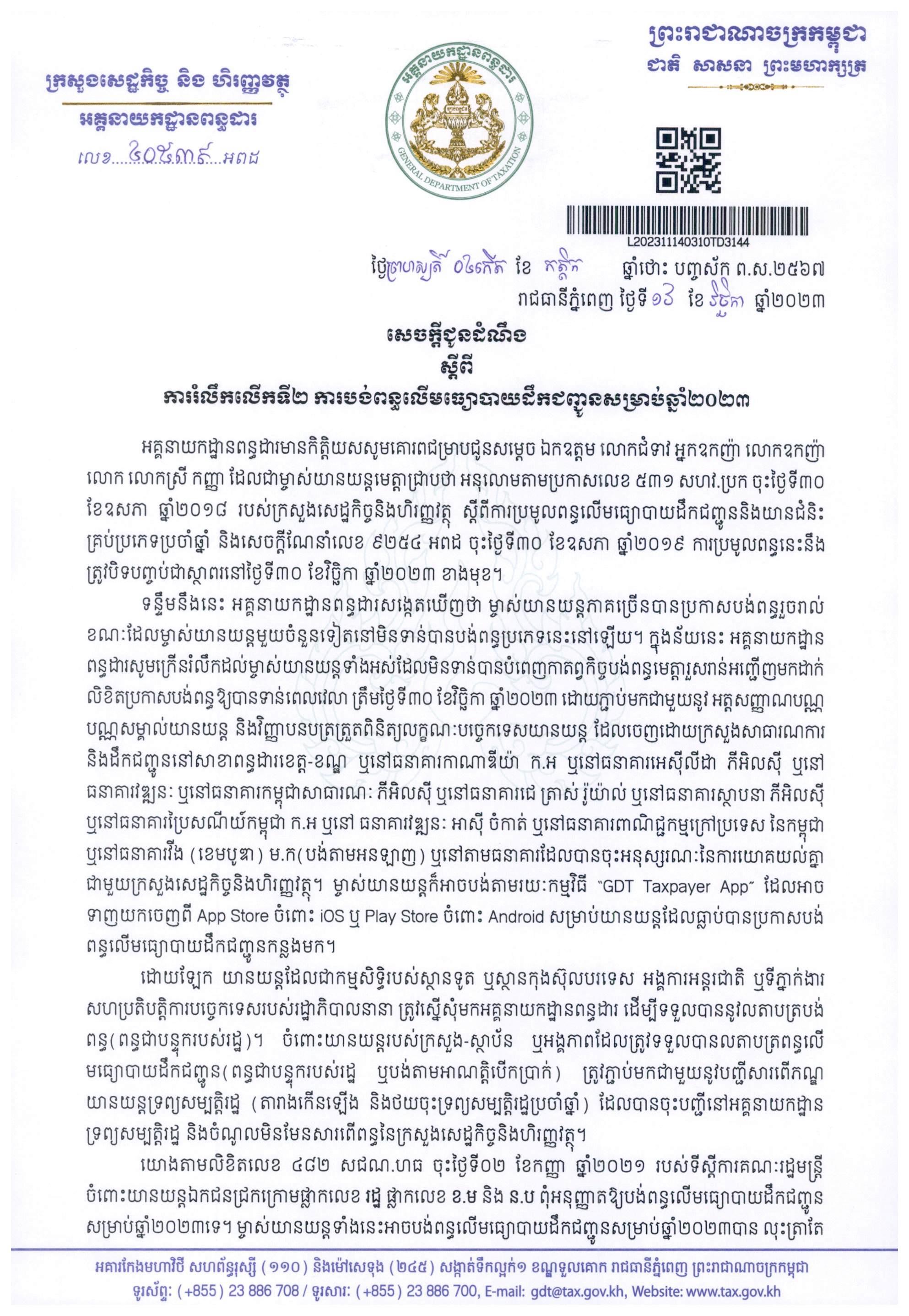 អគ្គនាយកដ្ឋានពន្ធដារ ក្រើនរំលឹកជាលើកទី២ ពីការបង់ពន្ធលើមធ្យោបាយដឹកជញ្ជូន សម្រាប់ឆ្នាំ២០២៣ ដែលត្រូវផុតកំណត់នៅចុងខែនេះ