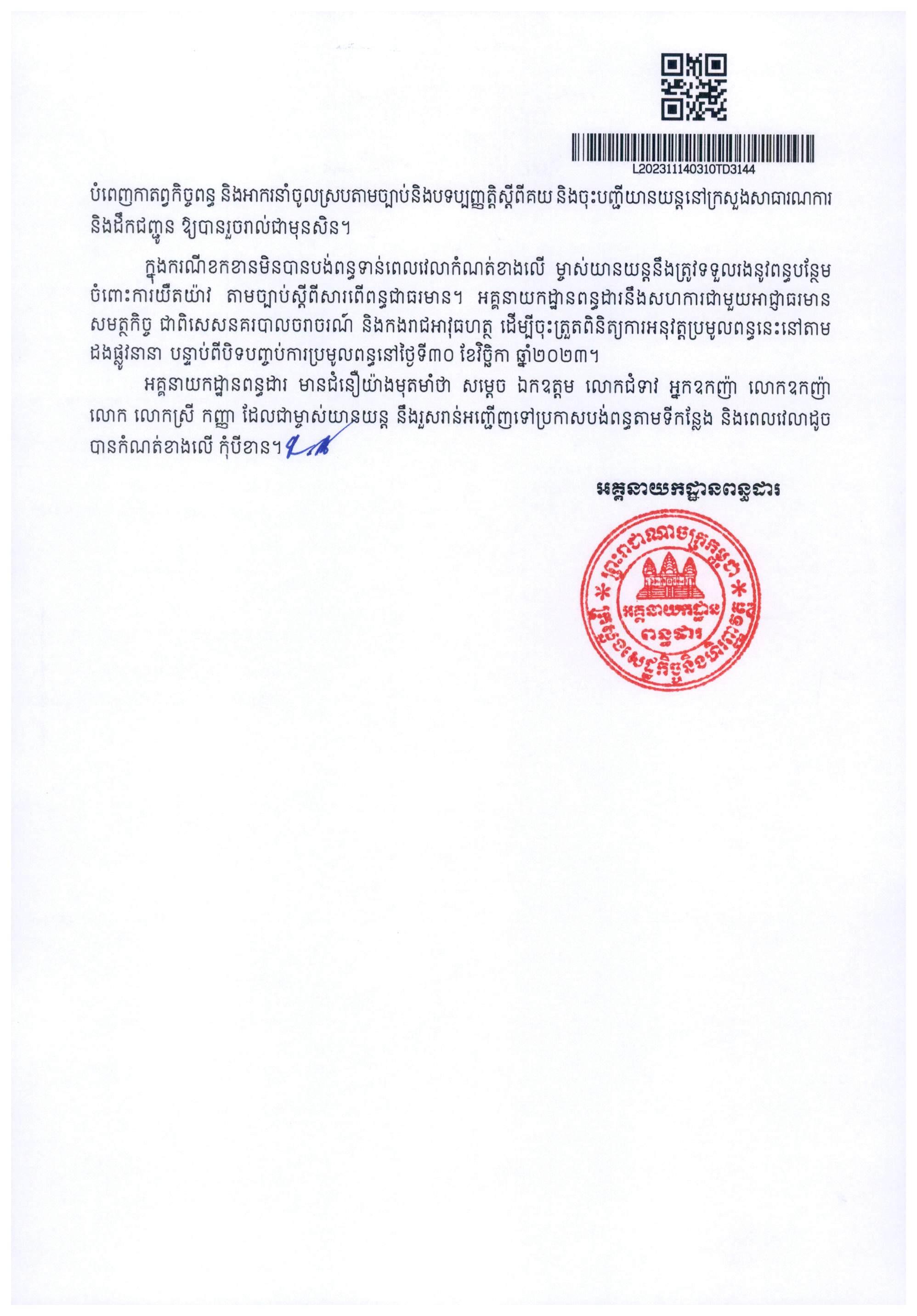 (ភ្នំពេញ)៖ អគ្គនាយកដ្ឋានពន្ធដារនៃក្រសួងសេដ្ឋកិច្ច និងហិរញ្ញវត្ថុ បានចេញសេចក្តីជូនដំណឹង ក្រើនរំលឹកជាលើកទី២ ពីការបង់ពន្ធលើមធ្យោបាយដឹកជញ្ជូន សម្រាប់ឆ្នាំ២០២៣ ដែលត្រូវផុតកំណត់នៅថ្ងៃទី៣០ ខែវិច្ឆិកា ឆ្នាំ២០២៣នេះ៕