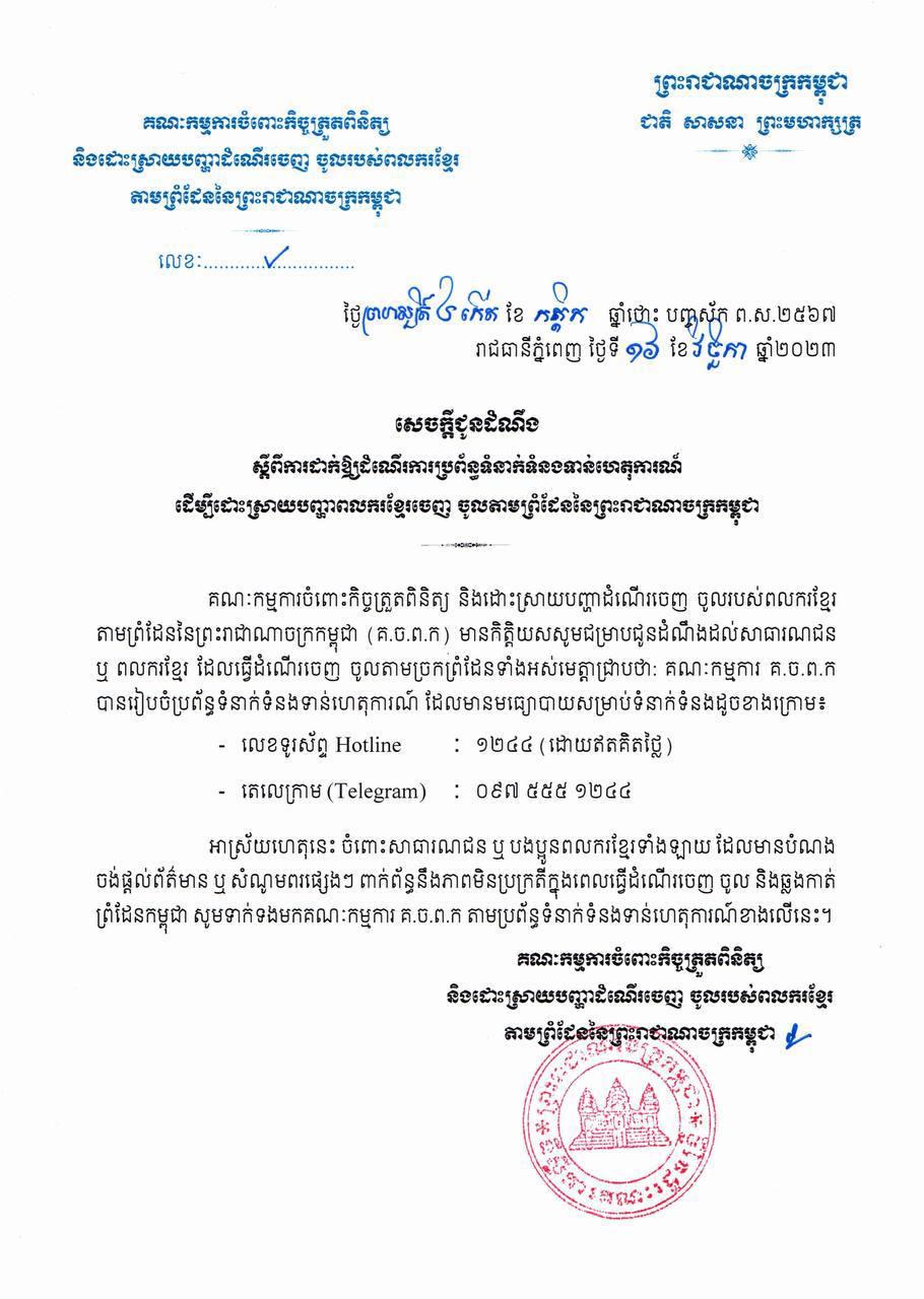 (ភ្នំពេញ)៖ គណៈកម្មការចំពោះកិច្ចត្រួតពិនិត្យ និងដោះស្រាយបញ្ហាដំណើរចេញចូលរបស់ពលករខ្មែរ តាមព្រំដែននៃព្រះរាជាណាចក្រកម្ពុជា (គ.ច.ព.ក) បានចេញសេចក្តីជូនដំណឹងស្ដីពី ការដាក់ឱ្យដំណើរការប្រព័ន្ធទំនាក់ទំនងទាន់ហេតុការណ៍ ដើម្បីដោះស្រាយបញ្ហាពលករខ្មែរចេញ ចូលតាមព្រំដែននៃព្រះរាជាណាចក្រកម្ពុជា។ នេះបើយោងតាមសេចក្ដីជូនដំណឹងដែលបណ្តាញព័ត៌មាន Fresh News ទទួលបាន។