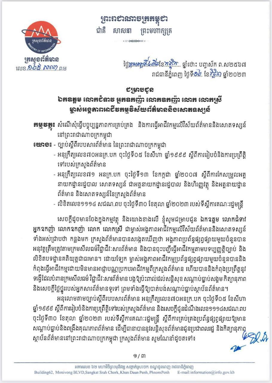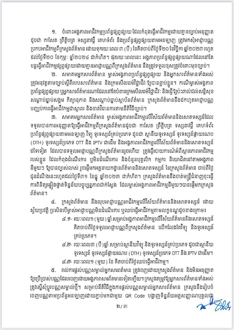 (ភ្នំពេញ)៖ ក្រសួងព័ត៌មាន បានជូនដំណឹងដល់ម្ចាស់អាជីវកម្មលើប្រព័ន្ធផ្សព្វផ្សាយទាំងឡាយ ដែលមិនទាន់មានច្បាប់ ត្រូវមកដាក់ពាក្យសុំច្បាប់នៅក្រសួងក្នុងរយៈពេល៣ខែ ពោលចាប់ពីថ្ងៃទី២០ ខែវិច្ឆិកា ឆ្នាំ២០២៣ រហូតដល់ថ្ងៃទី២០ ខែកុម្ភៈ ឆ្នាំ២០២៤។