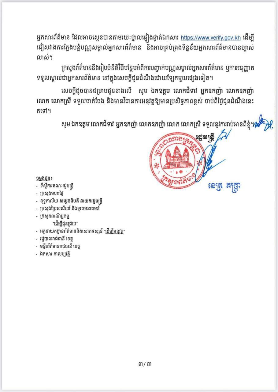 លោករដ្ឋមន្រ្តី បានបញ្ជាក់យ៉ាងដូច្នេះថា «រាល់ការផ្តល់បណ្ណសម្គាល់អ្នកសារព័ត៌មាន ត្រូវចេញដោយក្រសួងព័ត៌មាន និងមិនអនុញ្ញាតឲ្យប្រើប្រាស់បណ្ណ ដែលចេញដោយអង្គភាពសារព័ត៌មានទៀតឡើយ។ ក្រសួងតម្រូវឲ្យអ្នកសារព័ត៌មានទាំងអស់ ត្រូវស្នើសុំប្តូរបណ្ណសម្គាល់ថ្មី»។