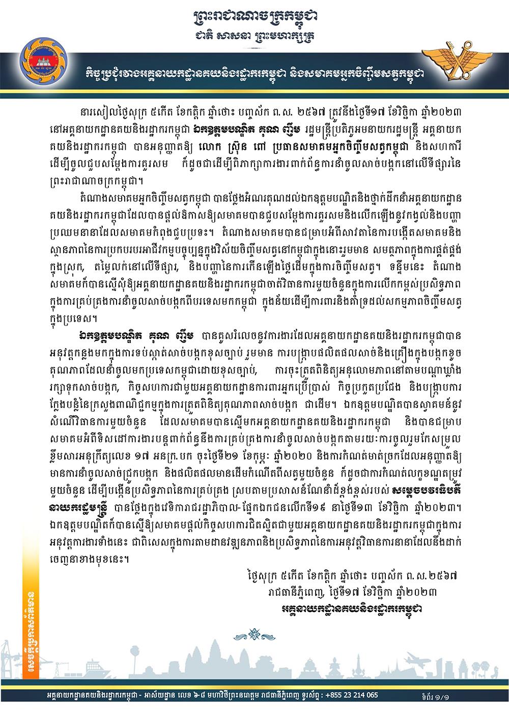 តំណាងសមាគមអ្នកចិញ្ចឹមសត្វកម្ពុជា បានថ្លែងអំណរគុណដល់បណ្ឌិត និងថ្នាក់ដឹកនាំអគ្គនាយកដ្ឋានគយ និងរដ្ឋាករកម្ពុជា ដែលបានផ្ដល់ឱកាសឱ្យសមាគមបានជួបសម្ដែងការគួរសម និងលើកឡើងនូវកង្វល់ និងបញ្ហាប្រឈមនានា ដែលសមាគមកំពុងជួបប្រទះ។