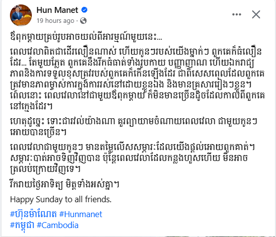 (ភ្នំពេញ)៖ សម្តេចមហាបវរធិបតី ហ៊ុន ម៉ាណែត នាយករដ្ឋមន្ត្រីកម្ពុជា លើកទឹកចិត្តអាណាព្យាបាលគ្រប់រូប គួរព្យាយាមចំណាយពេលវេលាជាមួយកូនឱ្យបានច្រើន។