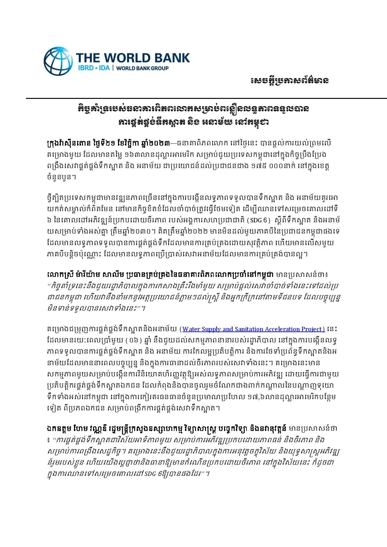 ធនាគារពិភពលោក ផ្ដល់ថវិកា១៦៣លានដុល្លារ សម្រាប់ជួយកម្ពុជា ក្នុងការពង្រឹងសេវាផ្គត់ផ្គង់ទឹកស្អាត និងអនាម័យ នៅខេត្ដចំនួន៤