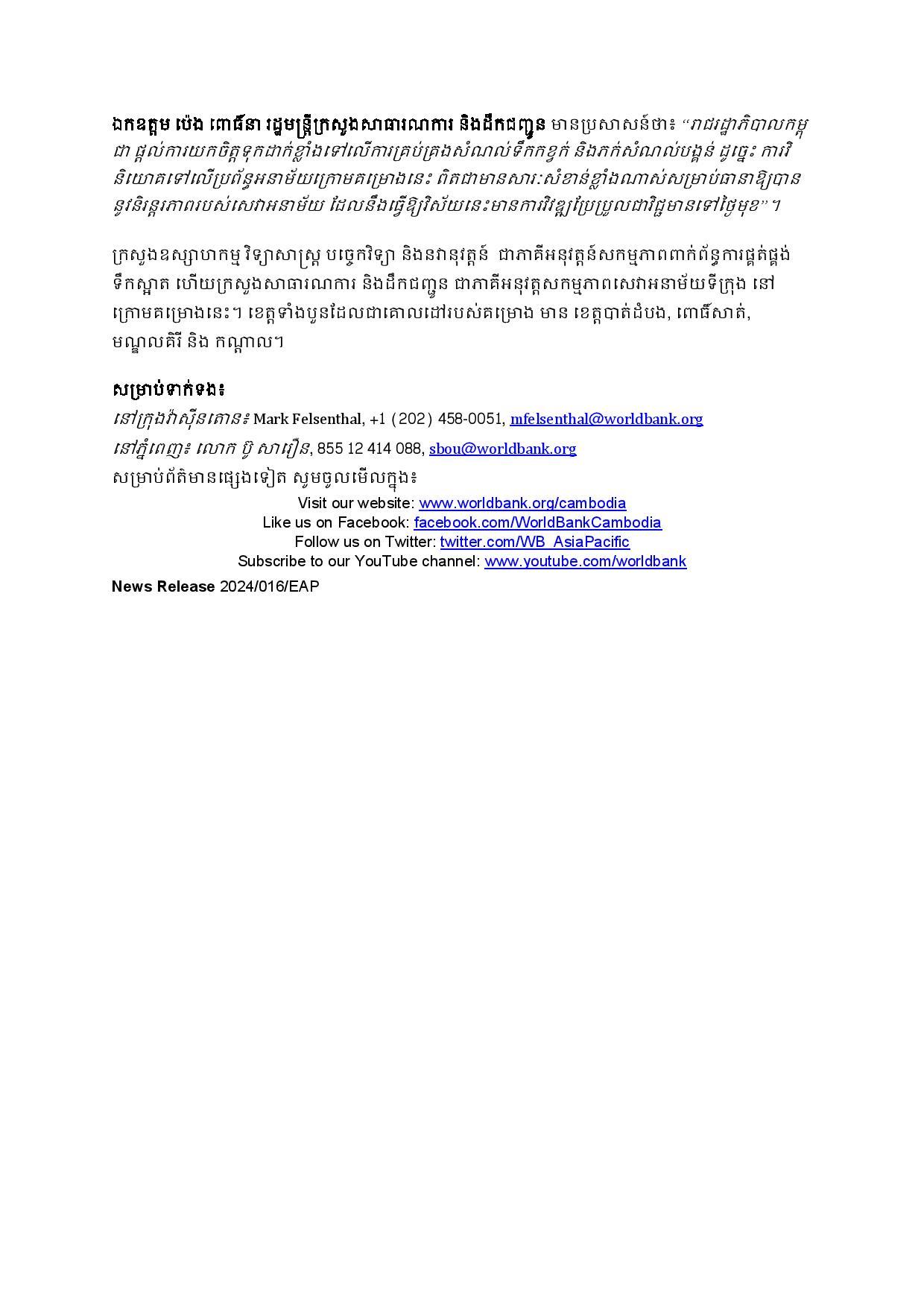 (ភ្នំពេញ)៖ ធនាគារពិភពលោកបានផ្តល់ការយល់ព្រមលើគម្រោងមួយ ដែលមានតម្លៃ១៦៣លានដុល្លារអាមេរិក សម្រាប់ជួយប្រទេសកម្ពុជា នៅក្នុងកិច្ចប្រឹងប្រែងពង្រឹងសេវាផ្គត់ផ្គង់ទឹកស្អាត និង អនាម័យ ជាប្រយោជន៍ដល់ប្រជាជនជាង ១៧៥ ០០០នាក់ នៅក្នុងខេត្តចំនួនបួន។ នេះបើតាមសេចក្ដីប្រកាសព័ត៌មាន របស់ធនាគារពិភពលោក ដែលបណ្ដាញព័ត៌មាន Fresh News ទទួលបាននៅថ្ងៃទី២២ ខែវិច្ឆិកា ឆ្នាំ២០២៣។