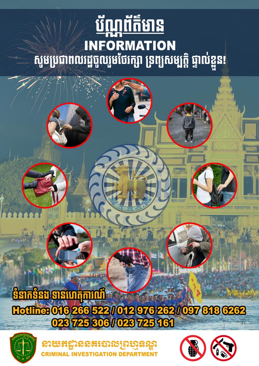 ក្នុងករណីប្រជាពលរដ្ឋដែលមកដើរលេងកម្សាន្ដ ហើយជួបប្រទះនូវបទល្មើសណាមួយកើតឡើង ឬបាត់សមាជិកគ្រួសារ សូមទំនាក់ទំនងទៅលេខទូរស័ព្ទខាងលើ ដើម្បីសមត្ថកិច្ចជួយអន្ដរាគមន៍ភ្លាមៗ។