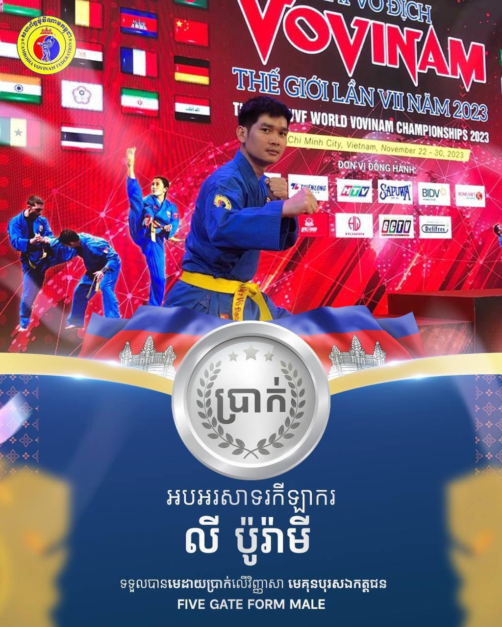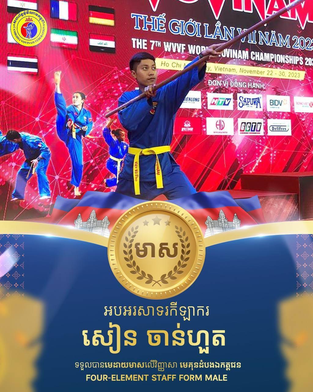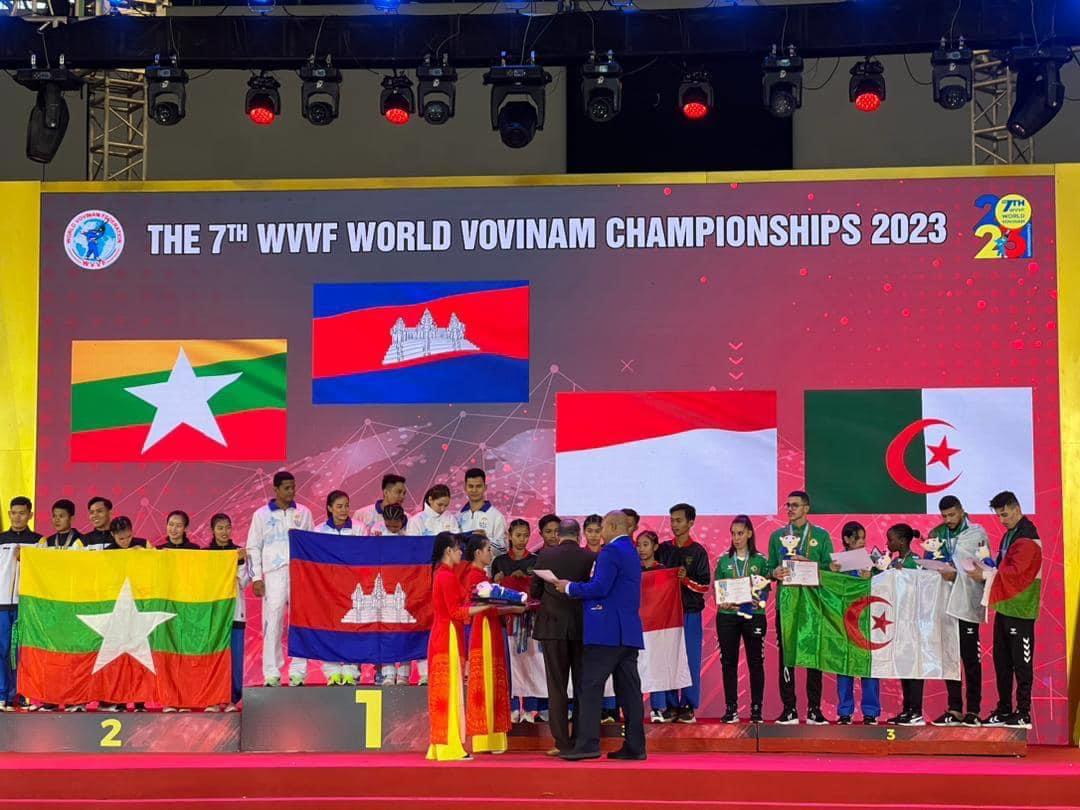(ភ្នំពេញ)៖ ក្រុមអត្តពលិកវ៉ូវីណាមកម្ពុជា ដណ្ដើមបានមេដាយ ៦គ្រឿង (មាស ២ ប្រាក់ ២ និងសំរឹទ្ធ ២) នៅក្នុងការប្រកួតកីឡាវ៉ូវីណាមជើងឯកពិភពលោក លើកទី៧ នៅទីក្រុងហូជីមិញ ប្រទេសវៀតណាម កាលពីថ្ងៃទី២៥ ខែវិច្ឆិកា ឆ្នាំ២០២៣។