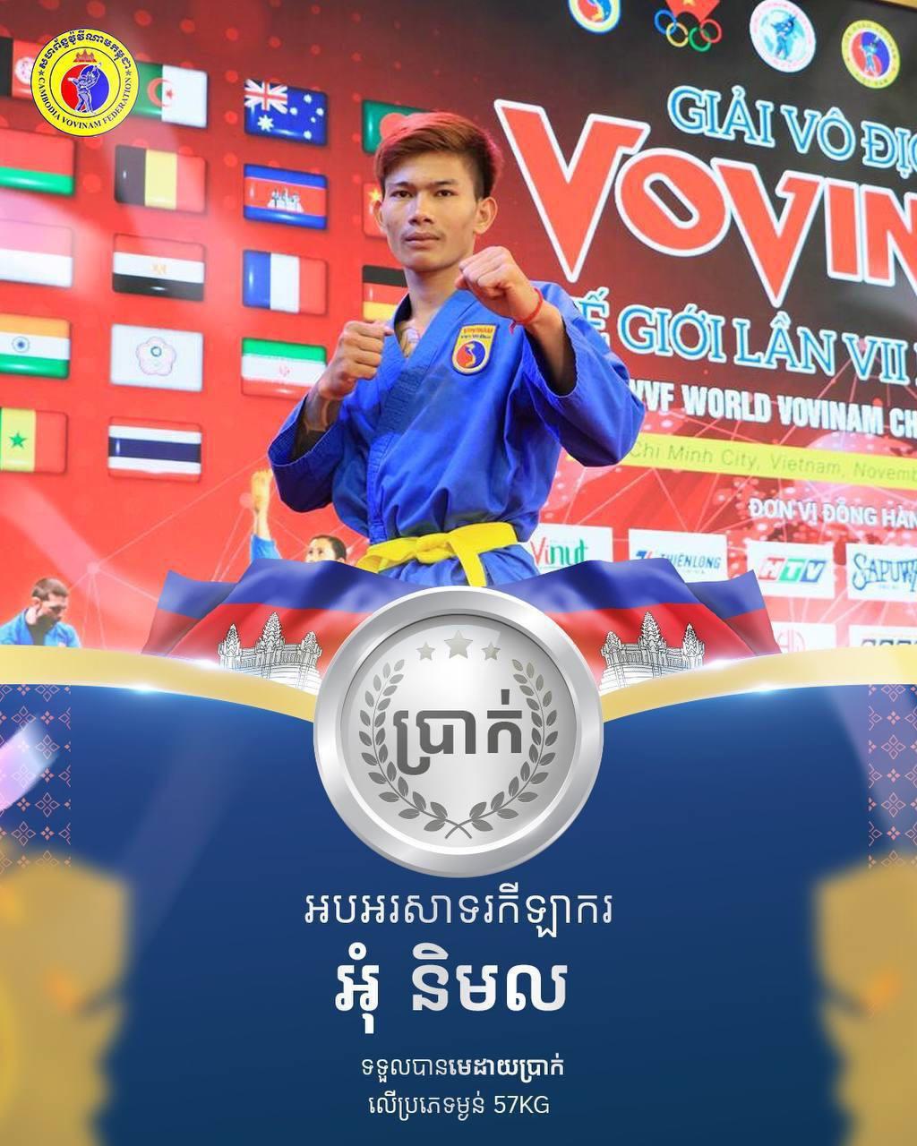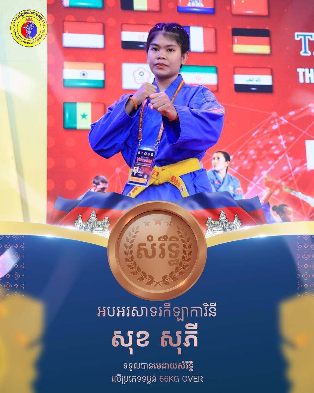 ចំណែកមេដាយសំរឹទ្ធ ២គ្រឿង ដណ្ដើមបានដោយកីឡាការិនី ឯម ច័ន្ទកនីកា ១ លើវិញ្ញាសាមេគុននារីឯកត្តជន និងកីឡាករ អុំ និមល លើវិញ្ញាសាប្រយុទ្ធទម្ងន់ ៥៧គីឡូក្រាម។ យ៉ាងណាមិញការប្រកួតដែលមានអត្តពលិក ៣៥ប្រទេសចូលរួមនេះ មិនទាន់បញ្ចប់នោះទេ ពោលគឺនឹងបន្ដការប្រកួត រហូតដល់ថ្ងសទី៣០ ខែវិច្ឆិកា ខណៈកម្ពុជា ក៏បានបញ្ជូនកីឡាករ-កីឡាការិនី ២៧នាក់ចូលរួមផងដែរ ដែលដឹកនាំដោយលោក អ៊ូ រតនា ប្រធានសហព័ន្ធកីឡាវ៉ូវីណាមកម្ពុជា៕ ផ្ដល់សិទ្ធិដោយ៖ Freshnews