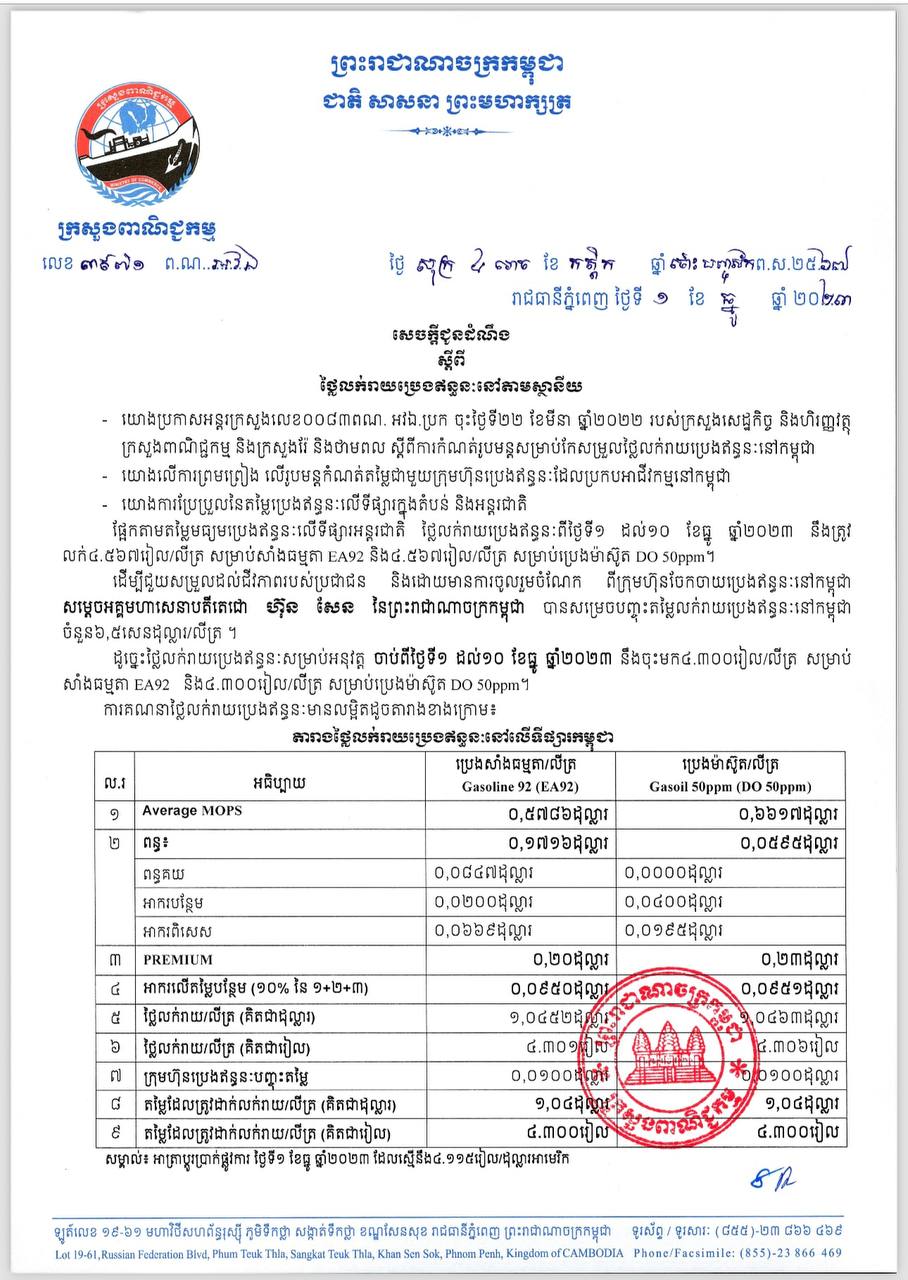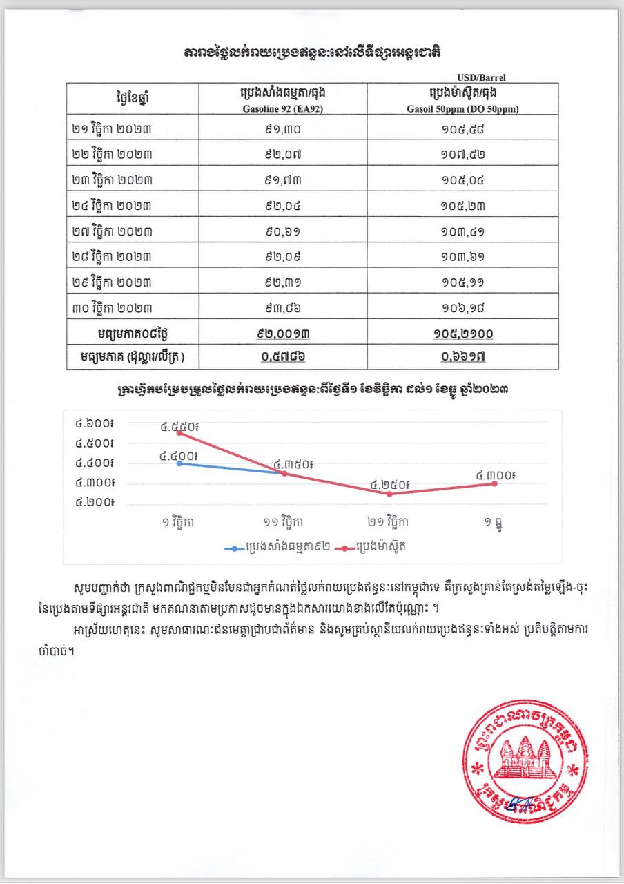 ក្រសួងពាណិជ្ជកម្ម៖ តម្លៃសាំងធម្មតា និងម៉ាស៊ូត ត្រូវលក់តម្លៃ ៤ ៣០០ចាប់ពីថ្ងៃនេះ ដល់ថ្ងៃទី១០ ខែធ្នូ ឆ្នាំ២០២៣