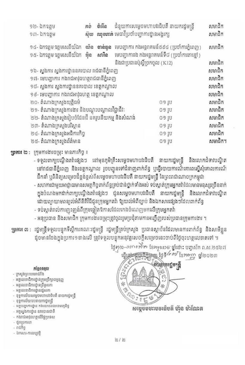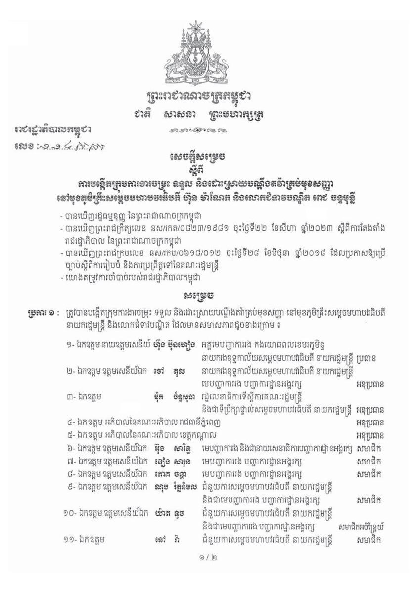 ក្រុមការងារចម្រុះ ទទួល និងដោះស្រាយបណ្ដឹងគ្រប់មុខសញ្ញានៅភូមិគ្រឹះរបស់សម្តេចធិបតី ហ៊ុន ម៉ាណែត មាននាយឧត្តមសេនីយ៍ ហ៉ីង ប៊ុនហៀង អគ្គមេបញ្ជាការរង កងយោធពលខេមរភូមិ នាយករងខុទ្ធកាល័យសម្តេចធិបតី នាយករដ្ឋមន្ត្រី ជាប្រធាន និងមានអនុប្រធាន សមាជិកមួយចំនួនទៀត៕