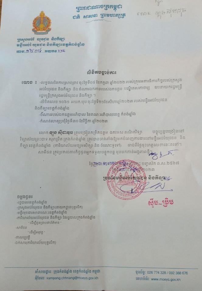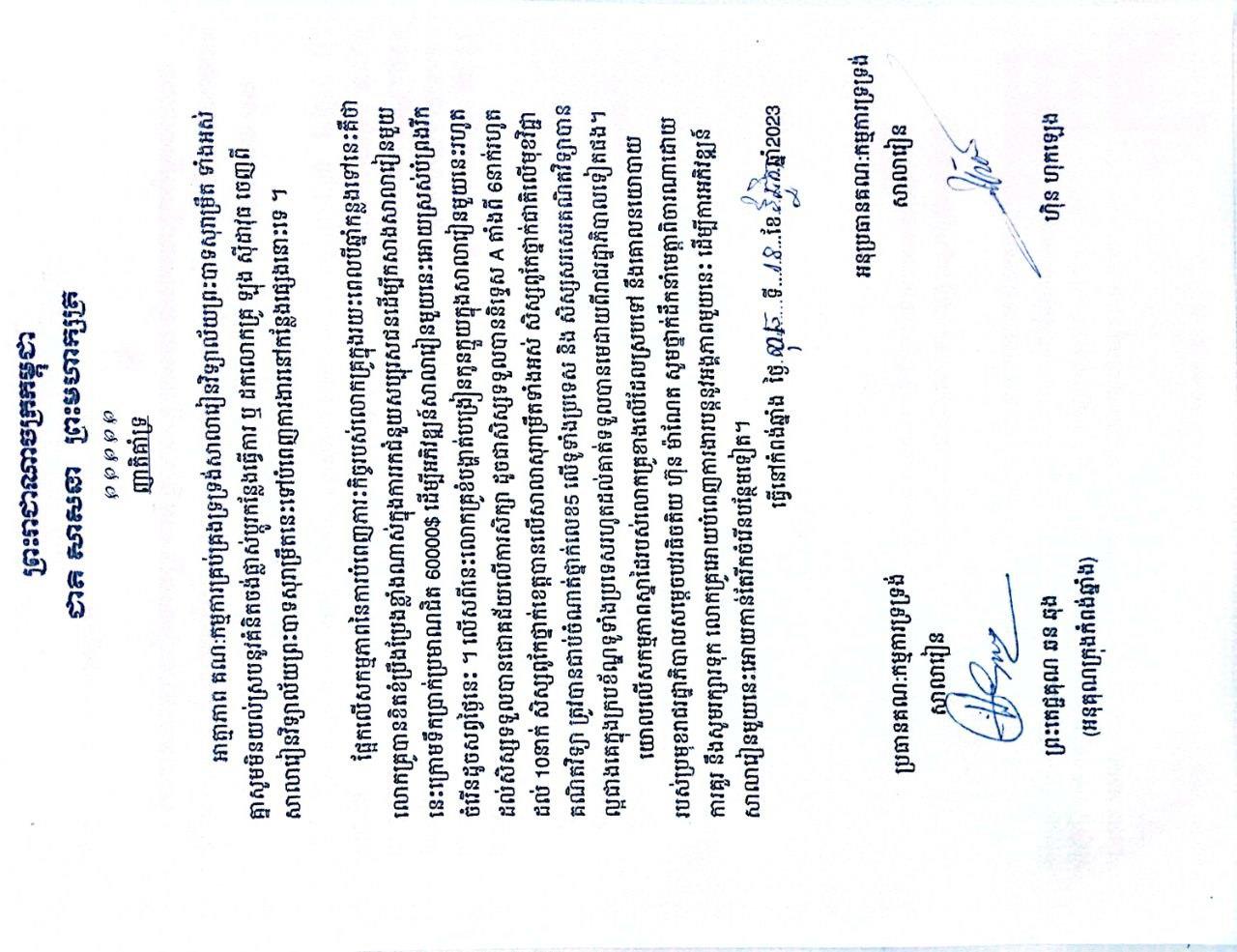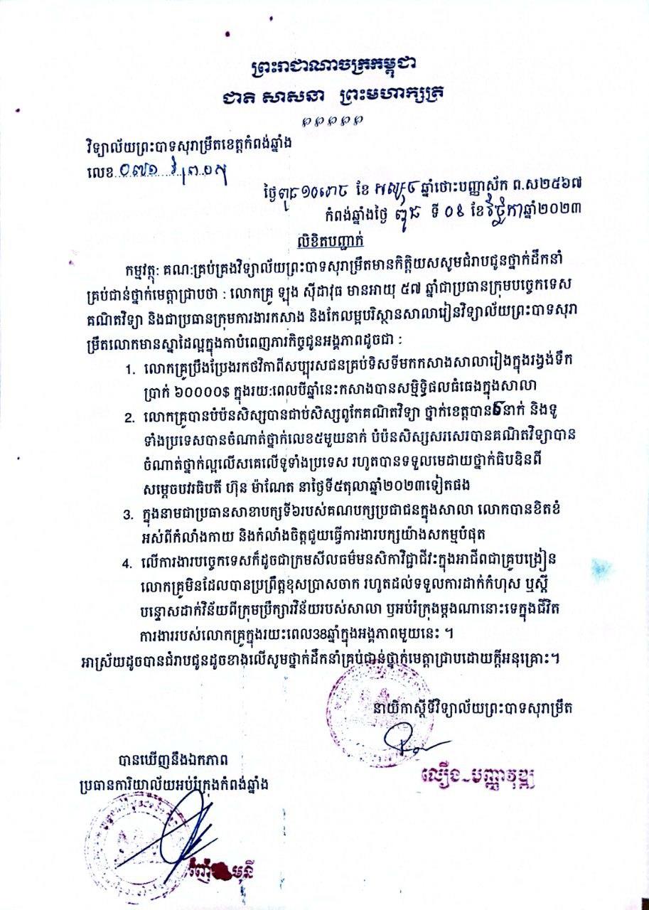*ទី១៖ លិខិតចុះថ្ងៃទី១៨ ខែវិច្ឆិកា ឆ្នាំ២០២៣ របស់លោកប្រធាន និងអនុប្រធានគណៈកម្មការទ្រទ្រង់សាលារៀន ចុះហត្ថលេខាដោយលោក ហ៊ុន ហុកឡេង និងព្រះតេជគុណ ឆន ឆុង (ព្រះអនុគណក្រុងកំពង់ឆ្នាំង)