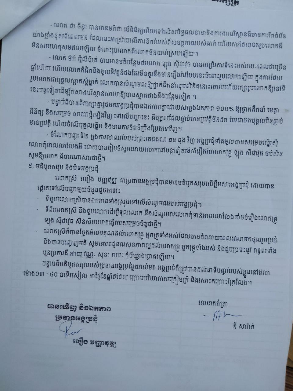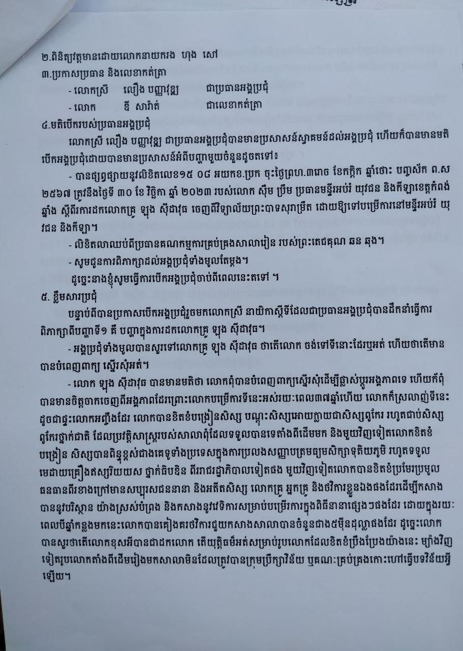 ដោយឡែកនៅក្នុងកំណត់ហេតុប្រជុំរវាងប្រធានក្រុមបច្ចេកទេស និងគណៈគ្រប់គ្រងសាលាពិភាក្សាលើបញ្ហារឿងដកលោក គ្រូ ឡុងស៊ីដាវុធ និងការលាឈប់ពីប្រធានគណៈកម្មការគ្រប់គ្រងរបស់ព្រះតេជគុណ ឆន ឆុង ចុះថ្ងៃទី៣០ ខែវិច្ឆិកា ឆ្នាំ២០២៣ ដែលមានសមាជិកចូលរួមប្រជុំចំនួន១៩នាក់ និងមានចុះហត្ថលេខារបស់លោកស្រី លឿង បញ្ញាវុឌ្ឍ នាយកស្ដីទី វិទ្យាល័យព្រះបាទសុរាម្រិត នៅក្នុងកំណត់ហេតុប្រជុំបានឯកភាពគ្នា១០០% ដោយស្នើសុំថ្នាក់ ដឹកនាំមន្ទីរ និងថ្នាក់ដឹកនាំក្រសួង ជាពិសេសសម្ដេចមហាបវរធិបតី ហ៊ុន ម៉ាណែត សូមមេត្តាពិនិត្យលើបញ្ហានេះដោយក្តីអនុគ្រោះ។