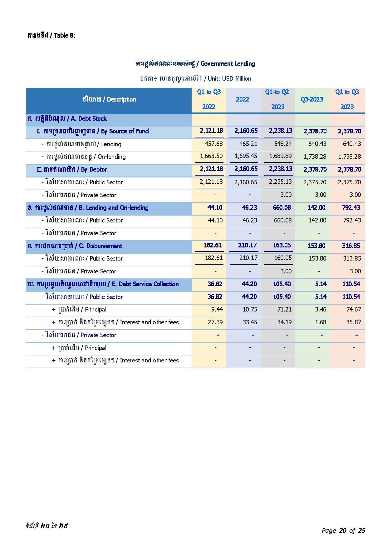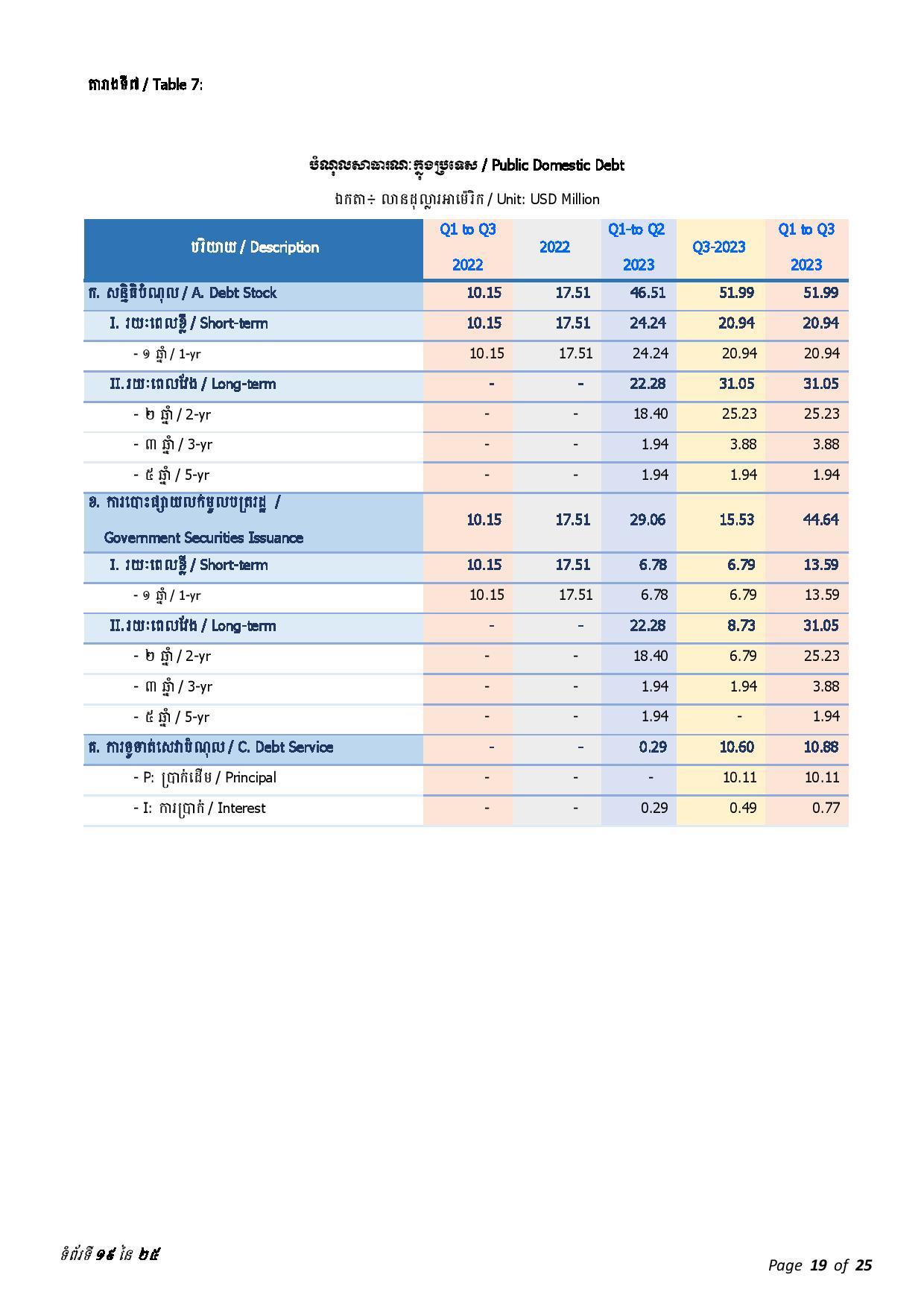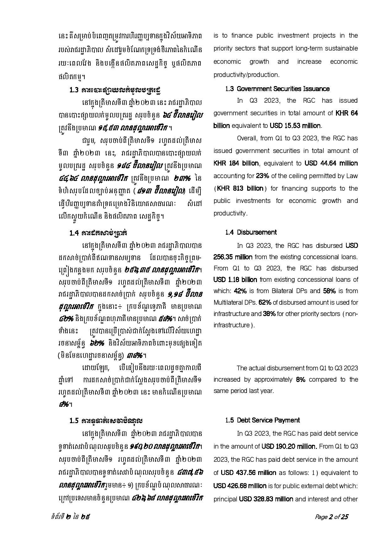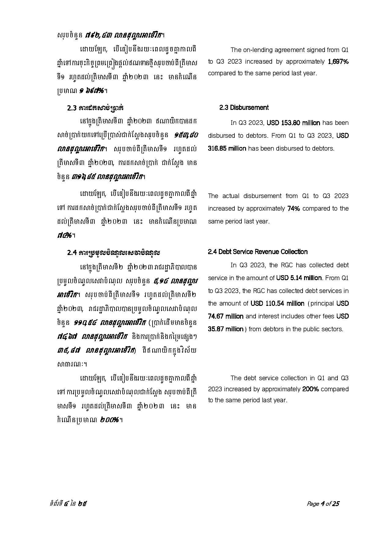 ជាមួយគ្នានេះ ចាប់ពីត្រីមាសទី១ រហូតដល់ត្រីមាសទី៣ ឆ្នាំ២០២៣ រាជរដ្ឋាភិបាលបានទូទាត់សេវាបំណុលសរុបចំនួន ៤៣៧.៥៦លានដុល្លារអាមេរិក រួមមាន៖ ១៖ ក្របខ័ណ្ឌបំណុលសាធារណៈក្រៅប្រទេស មានចំនួនប្រមាណ ៤២៦.៦៨ លានដុល្លារអាមេរិក ក្នុងនោះ ប្រាក់ដើម ៣២៨.៨៣ លានដុល្លារ និងការប្រាក់ និងកម្រៃផ្សេងៗ ៩៧.៨៥ លានដុល្លារ និង ២៖ ក្របខ័ណ្ឌបំណុលសាធារណៈក្នុងប្រទេស មានចំនួនប្រមាណ ១០.៨៨ លានដុល្លារ ក្នុងនោះ៖ ប្រាក់ដើម ១០.១១ដុល្លារ និងការប្រាក់០.៧៧ លានដុល្លារ។
