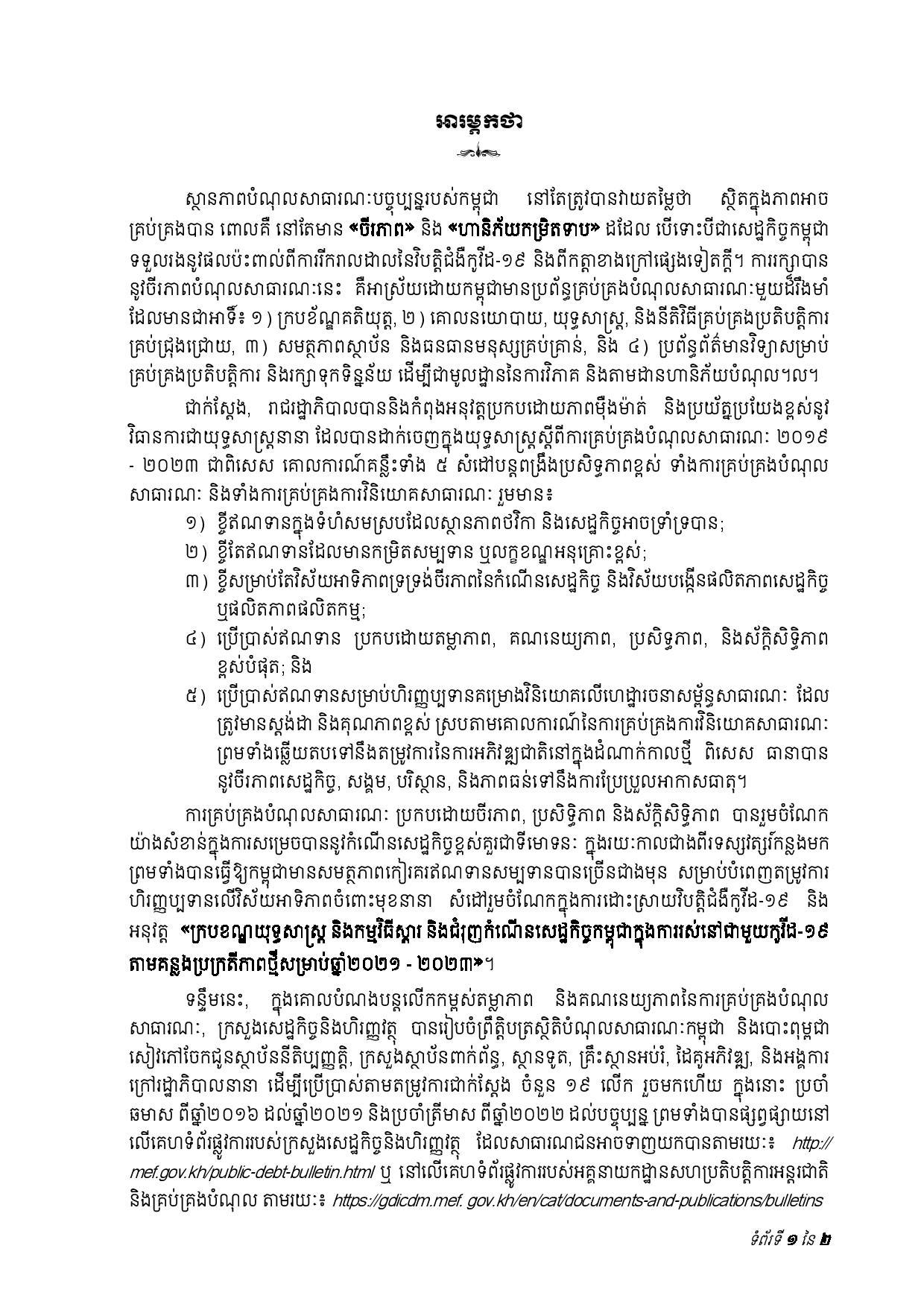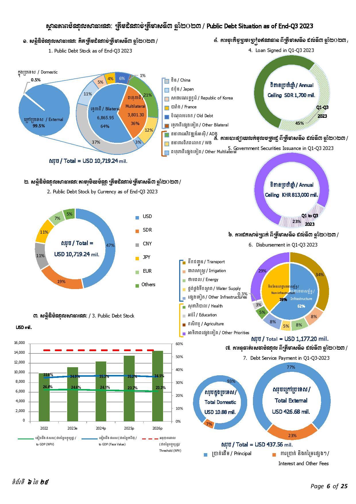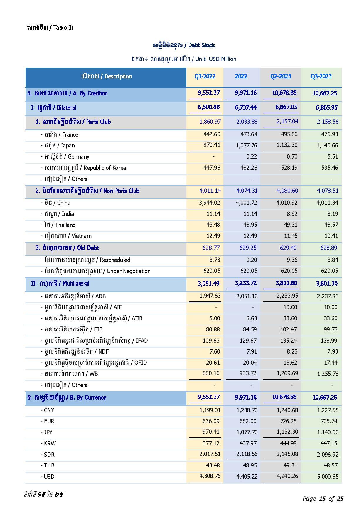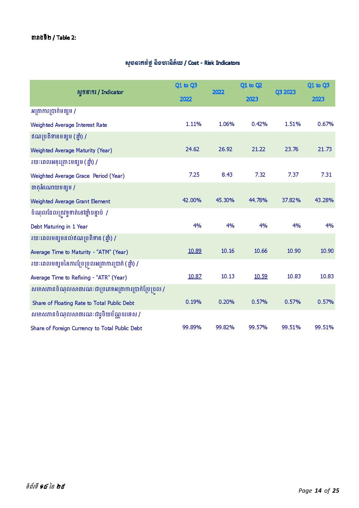ជាមួយគ្នានេះ ចាប់ពីត្រីមាសទី១ រហូតដល់ត្រីមាសទី៣ ឆ្នាំ២០២៣ រាជរដ្ឋាភិបាលបានទូទាត់សេវាបំណុលសរុបចំនួន ៤៣៧.៥៦លានដុល្លារអាមេរិក រួមមាន៖ ១៖ ក្របខ័ណ្ឌបំណុលសាធារណៈក្រៅប្រទេស មានចំនួនប្រមាណ ៤២៦.៦៨ លានដុល្លារអាមេរិក ក្នុងនោះ ប្រាក់ដើម ៣២៨.៨៣ លានដុល្លារ និងការប្រាក់ និងកម្រៃផ្សេងៗ ៩៧.៨៥ លានដុល្លារ និង ២៖ ក្របខ័ណ្ឌបំណុលសាធារណៈក្នុងប្រទេស មានចំនួនប្រមាណ ១០.៨៨ លានដុល្លារ ក្នុងនោះ៖ ប្រាក់ដើម ១០.១១ដុល្លារ និងការប្រាក់០.៧៧ លានដុល្លារ។