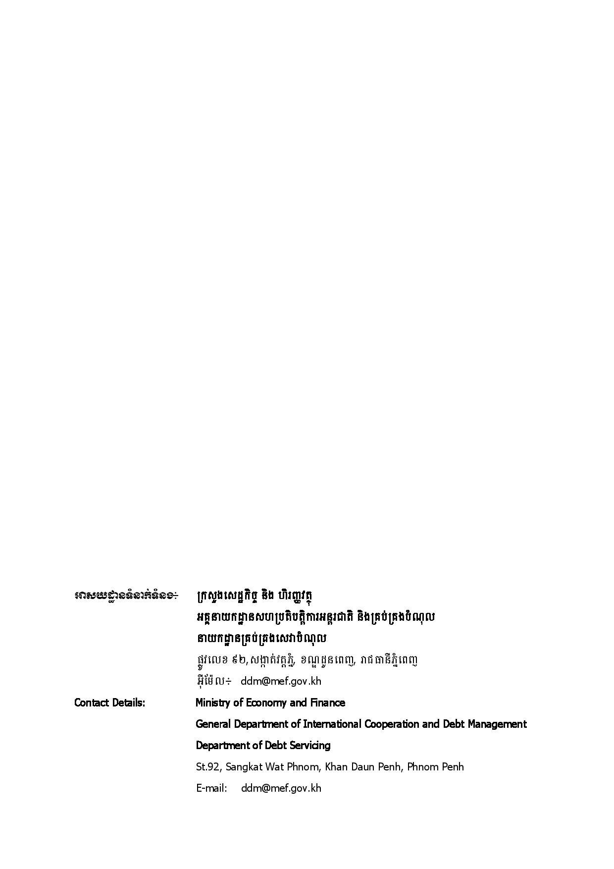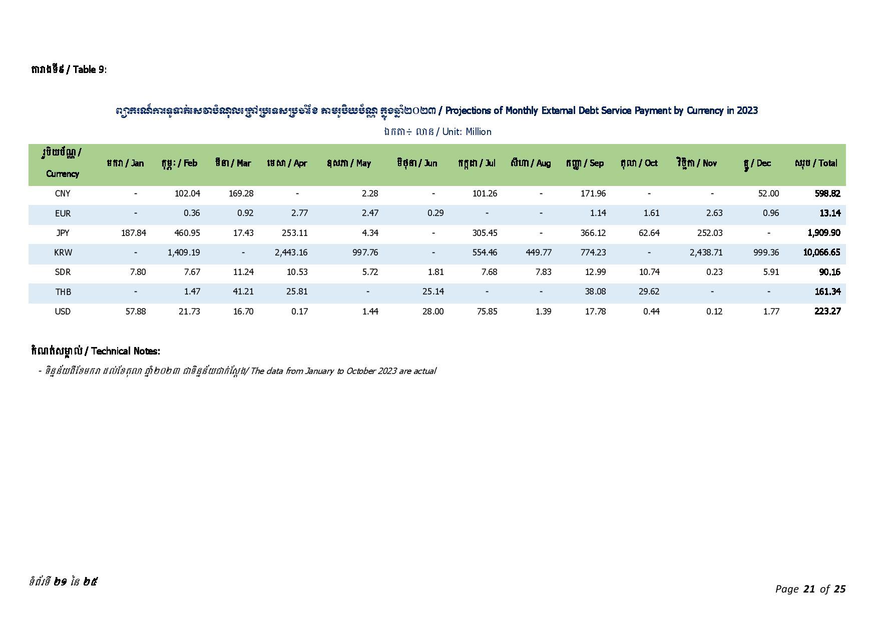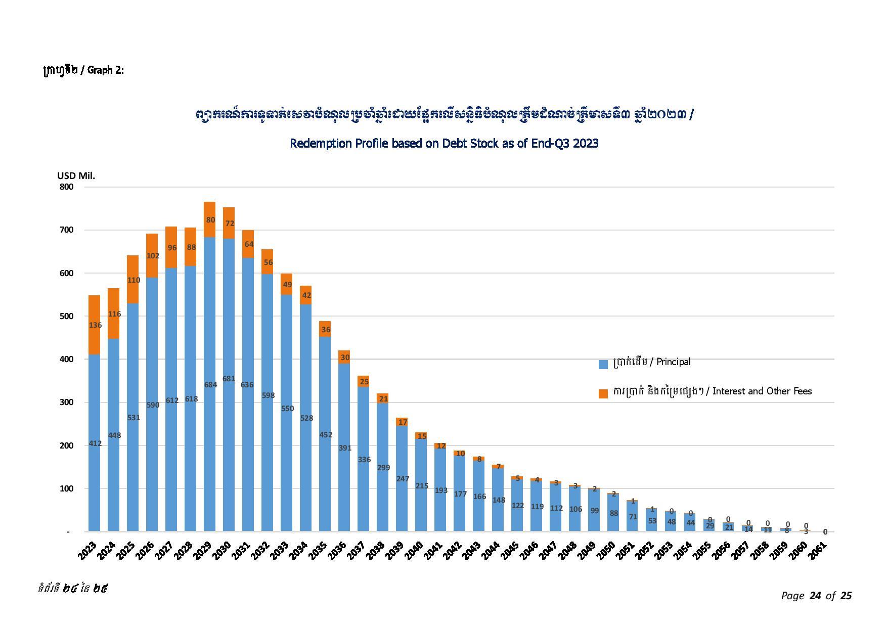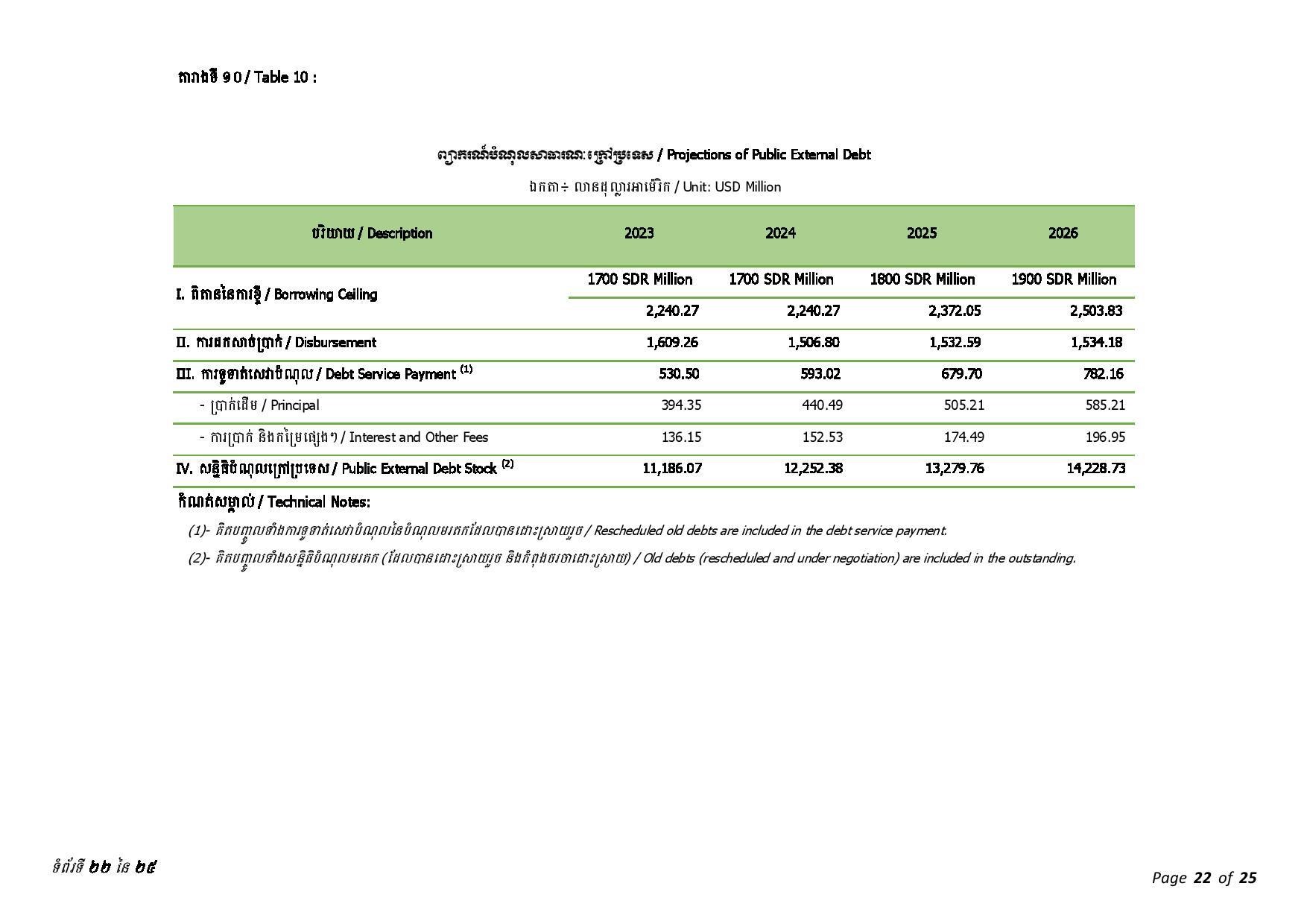 ជាមួយគ្នានេះ ចាប់ពីត្រីមាសទី១ រហូតដល់ត្រីមាសទី៣ ឆ្នាំ២០២៣ រាជរដ្ឋាភិបាលបានទូទាត់សេវាបំណុលសរុបចំនួន ៤៣៧.៥៦លានដុល្លារអាមេរិក រួមមាន៖ ១៖ ក្របខ័ណ្ឌបំណុលសាធារណៈក្រៅប្រទេស មានចំនួនប្រមាណ ៤២៦.៦៨ លានដុល្លារអាមេរិក ក្នុងនោះ ប្រាក់ដើម ៣២៨.៨៣ លានដុល្លារ និងការប្រាក់ និងកម្រៃផ្សេងៗ ៩៧.៨៥ លានដុល្លារ និង ២៖ ក្របខ័ណ្ឌបំណុលសាធារណៈក្នុងប្រទេស មានចំនួនប្រមាណ ១០.៨៨ លានដុល្លារ ក្នុងនោះ៖ ប្រាក់ដើម ១០.១១ដុល្លារ និងការប្រាក់០.៧៧ លានដុល្លារ។
