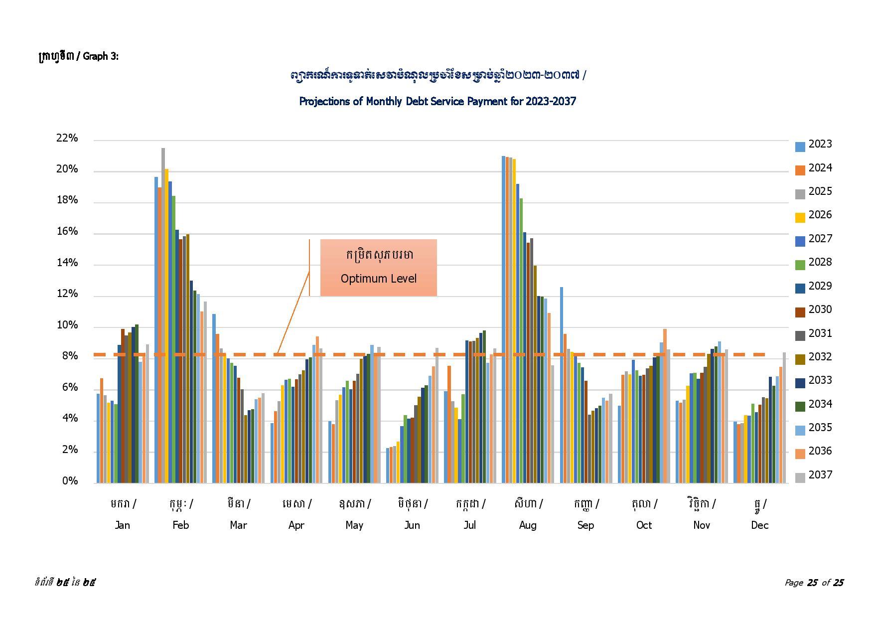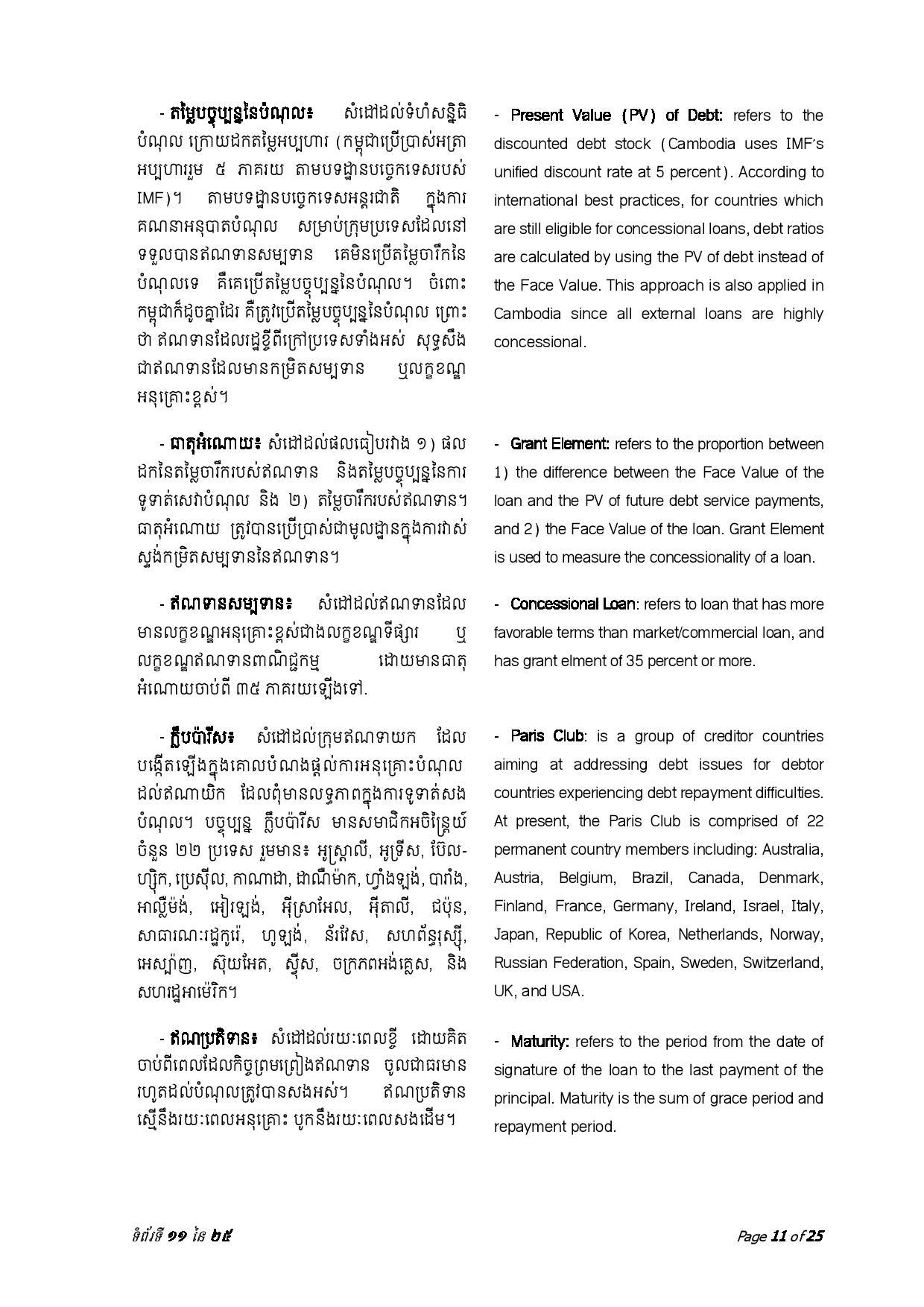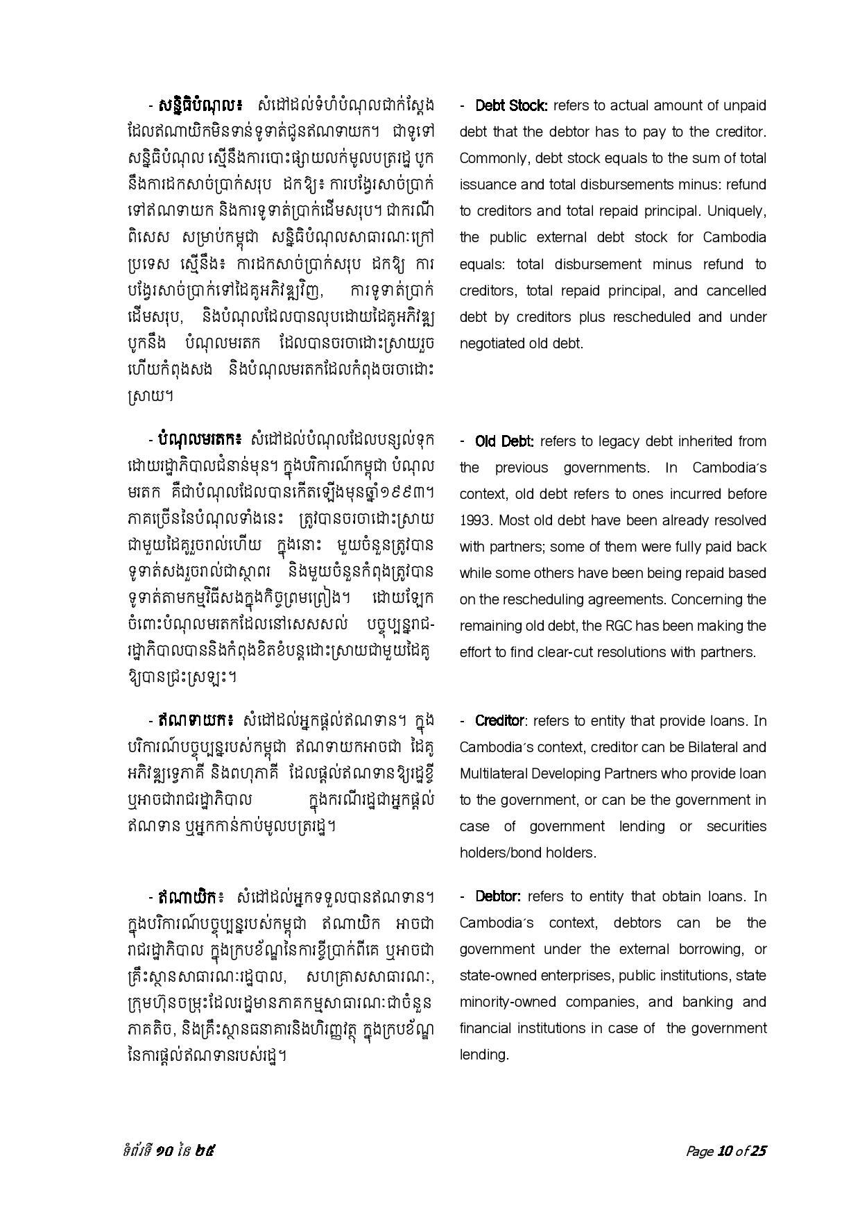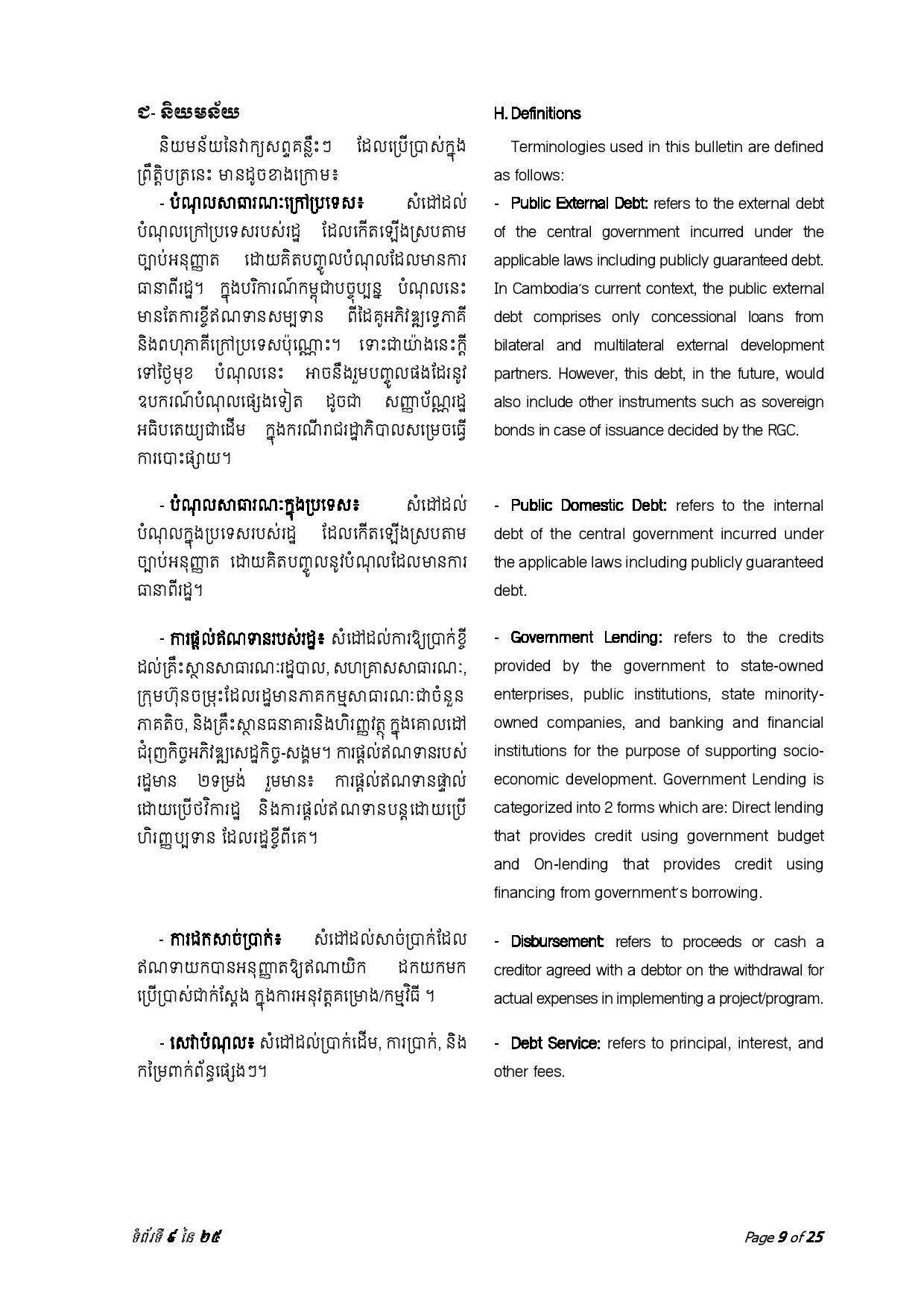 ជាមួយគ្នានេះ ចាប់ពីត្រីមាសទី១ រហូតដល់ត្រីមាសទី៣ ឆ្នាំ២០២៣ រាជរដ្ឋាភិបាលបានទូទាត់សេវាបំណុលសរុបចំនួន ៤៣៧.៥៦លានដុល្លារអាមេរិក រួមមាន៖ ១៖ ក្របខ័ណ្ឌបំណុលសាធារណៈក្រៅប្រទេស មានចំនួនប្រមាណ ៤២៦.៦៨ លានដុល្លារអាមេរិក ក្នុងនោះ ប្រាក់ដើម ៣២៨.៨៣ លានដុល្លារ និងការប្រាក់ និងកម្រៃផ្សេងៗ ៩៧.៨៥ លានដុល្លារ និង ២៖ ក្របខ័ណ្ឌបំណុលសាធារណៈក្នុងប្រទេស មានចំនួនប្រមាណ ១០.៨៨ លានដុល្លារ ក្នុងនោះ៖ ប្រាក់ដើម ១០.១១ដុល្លារ និងការប្រាក់០.៧៧ លានដុល្លារ។