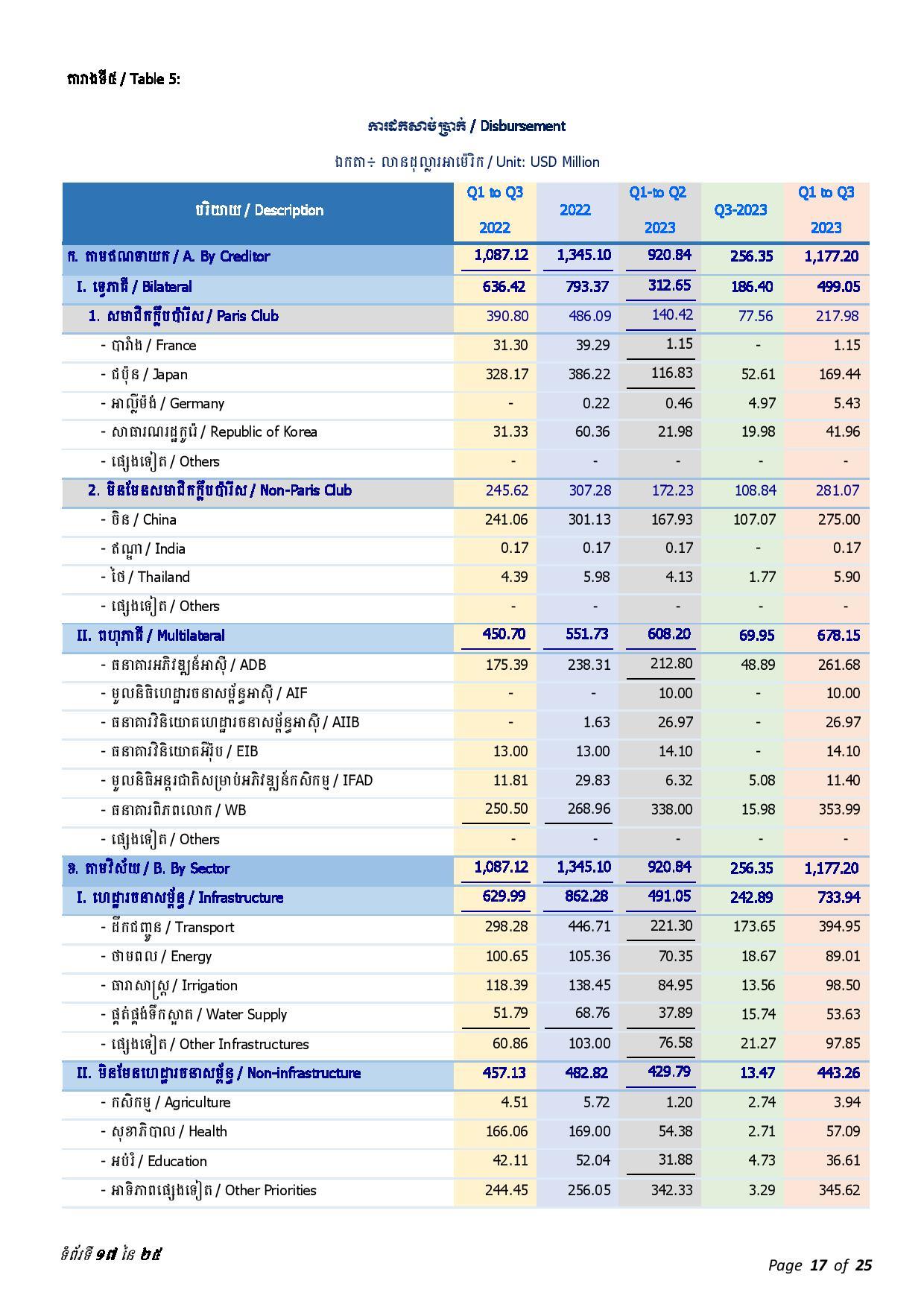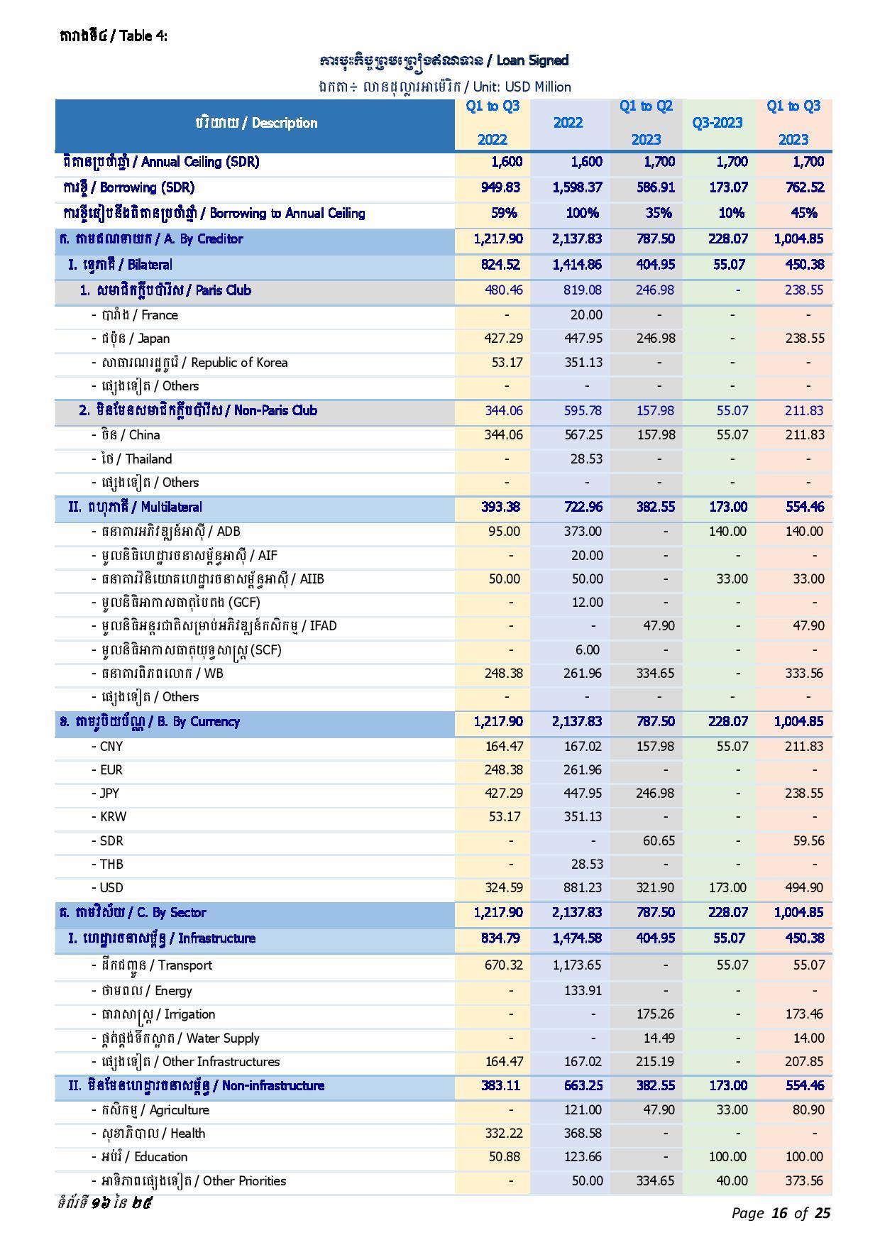 ក្រសួងសេដ្ឋកិច្ចបានបញ្ជាក់ថា «សរុបចាប់ពីត្រីមាសទី១ រហូតដល់ត្រីមាសទី៣ ឆ្នាំ២០២៣នេះ រាជរដ្ឋាភិបាល បានចុះកិច្ចព្រមព្រៀងឥណទានសម្បទានថ្មី ជាមួយដៃគូអភិវឌ្ឍនានាសរុបចំនួន ១ប៊ីលានដុល្លារ សមមូលនឹង ៧៦២.៥២ លានអេសដេអ៊ែរ ស្មើនឹងប្រមាណ ៤៥% នៃពិតានដែលច្បាប់អនុញ្ញាត (១ ៧០០ លានអេសដេអ៊ែរ) ក្នុងនោះក្របខ័ណ្ឌទ្វេភាគី មានប្រមាណ ៤៥% និងក្របខ័ណ្ឌពហុភាគី មានប្រមាណ ៥៥%»។