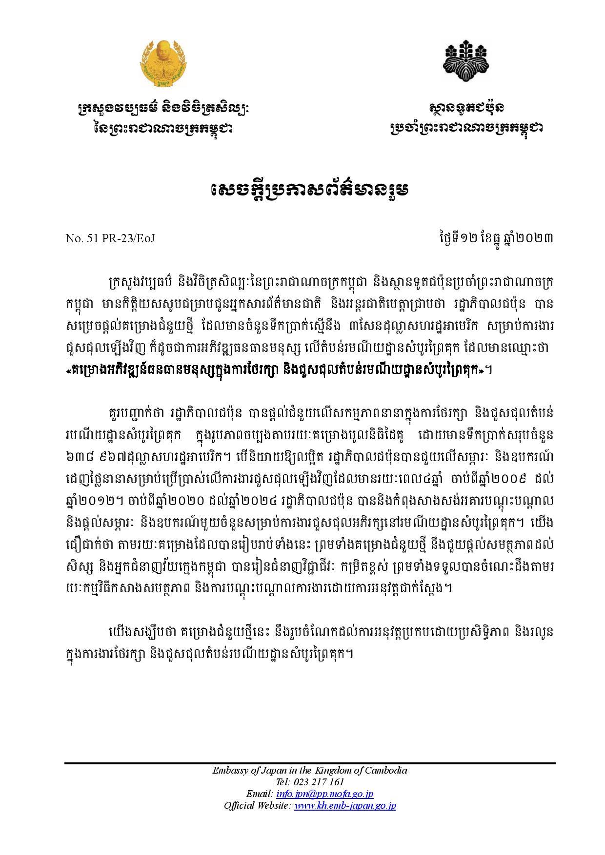 រដ្ឋាភិបាលជប៉ុន ជឿជាក់ថា តាមរយៈគម្រោងដែលបានរៀបរាប់ទាំងនេះ ព្រមទាំងគម្រោងជំនួយថ្មីនឹងជួយផ្ដល់សមត្ថភាពដល់សិស្ស និងអ្នកជំនាញវ័យក្មេងកម្ពុជា បានរៀនជំនាញវិជ្ជាជីវៈកម្រិតខ្ពស់ ព្រមទាំងទទួលបានចំណេះដឹង តាមរយៈកម្មវិធីកសាងសមត្ថភាព និងការបណ្តុះបណ្តាលការងារដោយការអនុវត្តជាក់ស្ដែង៕ ផ្តល់សិទ្ធិដោយ៖ freshnews