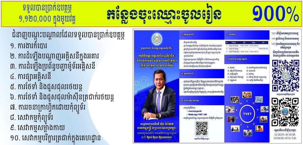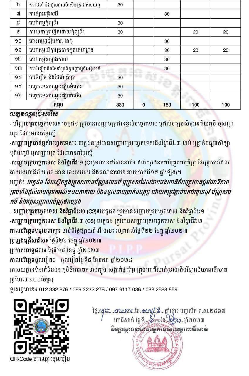 (ពោធិ៍សាត់)៖ វិទ្យាស្ថានពហុបច្ចេកទេសខេត្តពោធិ៍សាត់ ផ្តល់អាហារូបករណ៍ដល់យុវជនមកពីគ្រួសារក្រីក្រ និងគ្រួសារងាយរងហានិភ័យចំនួន៣៣០នាក់ ឱ្យចូលរៀនជំនាញវិជ្ជាជីវៈ និងបច្ចេកទេសលើមុខជំនាញសំខាន់ៗចំនួន ១៦ប្រភេទ ដោយឥតគិតថ្លៃ និងទទួលបានប្រាក់ឧបត្ថម្ភពីរាជរដ្ឋាភិបាល។ នេះបើយោងតាមសេចក្តីប្រកាសព័ត៌មានរបស់វិទ្យាស្ថានកាលពីថ្ងៃទី១១ ខែធ្នូ ឆ្នាំ២០២៣។