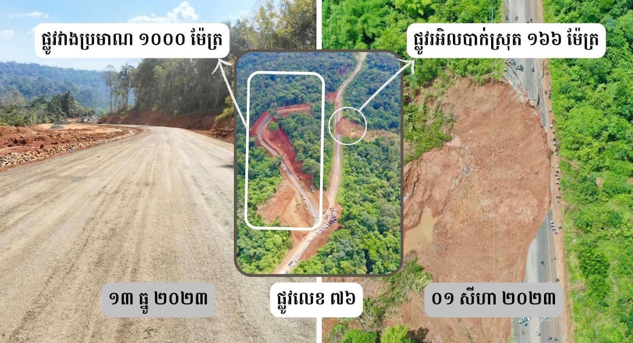 (មណ្ឌលគិរី)៖ កំណាត់ផ្លូវជាតិលេខ៧៦ ដែលបានបាក់ស្រុត ប្រមាណ១៦៦ម៉ែត្រ ត្រង់ចំណុចអូរងើយ ភូមិអណ្ដូងក្រឡឹង ឃុំសែនមនោរម្យ ស្រុកអូររាំង ខេត្តមណ្ឌលគិរី ចន្លោះ PK94+080 – PK94+150 កាលពីថ្ងៃទី០១ ខែសីហា ឆ្នាំ២០២៣ ត្រូវបានដាក់ឱ្យប្រើប្រាស់បណ្តោះអាសន្នកាលពីថ្ងៃទី០៨ ខែសីហា ឆ្នាំ២០២៣ កំពុងត្រូវបានបន្តការស្ថាបនាផ្លូវវាង ប្រមាណ ១០០០ម៉ែត្រ និងគ្រោងបញ្ចប់ការសាងសង់ទាំងស្រុងនៅចុងខែធ្នូ ឆ្នាំ២០២៣នេះហើយ។