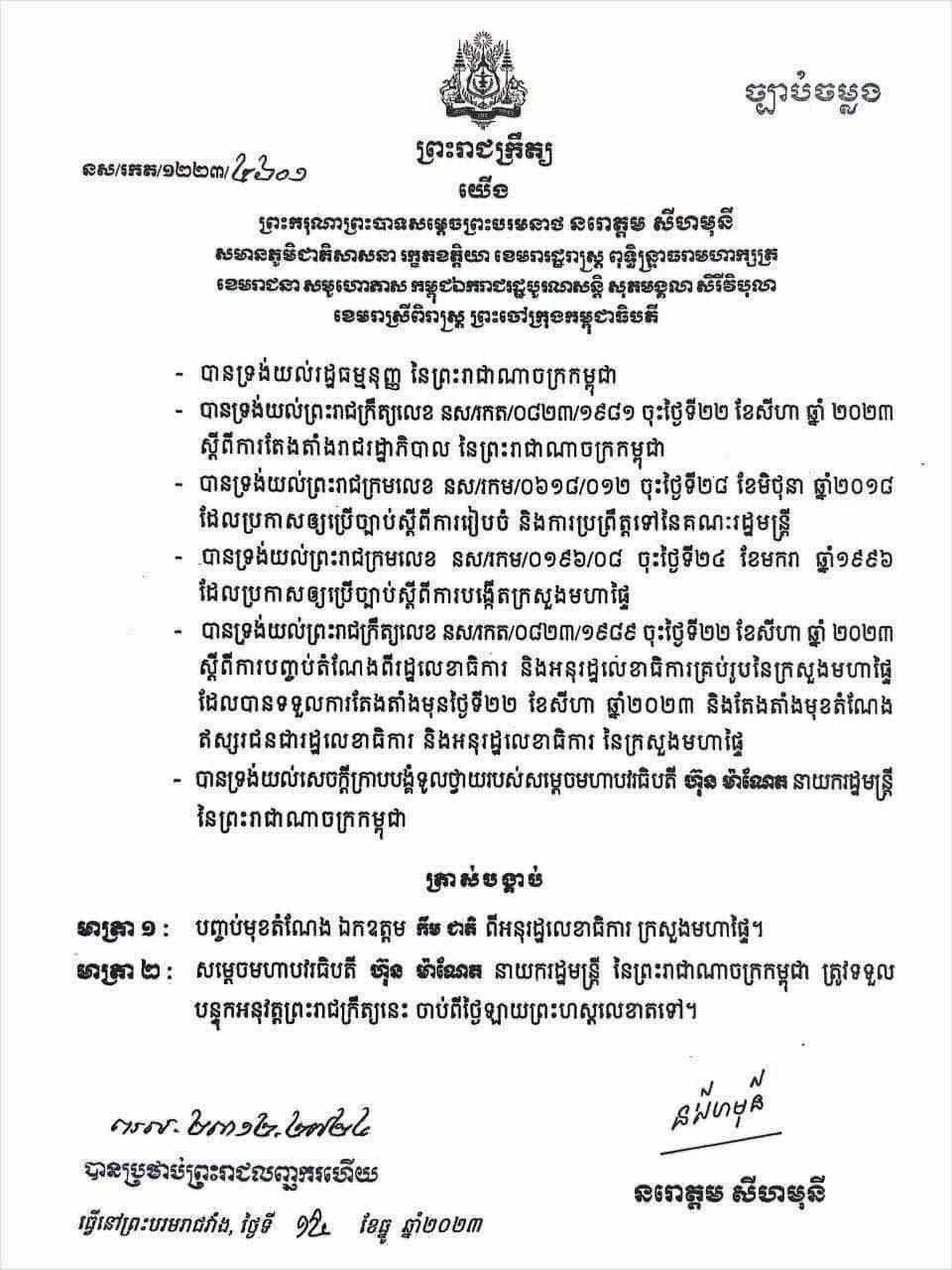 (ភ្នំពេញ)៖ ព្រះករុណា ព្រះបាទសម្ដេច ព្រះមរបនាថ នរោត្តម សីហមុនី ព្រះមហាក្សត្រនៃកម្ពុជា ទ្រង់បានចេញព្រះរាជក្រឹត្យបញ្ចប់មុខតំណែង លោក កឹម ជាតិ ពីអនុរដ្ឋលេខាធិការក្រសួងមហាផ្ទៃ។ នេះបើតាមព្រះរាជក្រឹត្យ ដែលបណ្ដាញព័ត៌មាន Fresh News ទទួលបាននៅថ្ងៃទី១៦ ខែធ្នូ ឆ្នាំ២០២៣។
