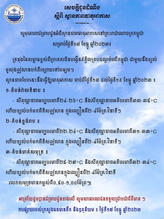 ក្រសួងធនធានទឹក ចេញសេចក្ដីជូនដំណឹង ស្ដីពីស្ថានភាពអាកាសធាតុ នៅព្រះរាជាណាចក្រកម្ពុជា សម្រាប់ថ្ងៃទី ១៧ ខែធ្នូ ឆ្នាំ២០២៣