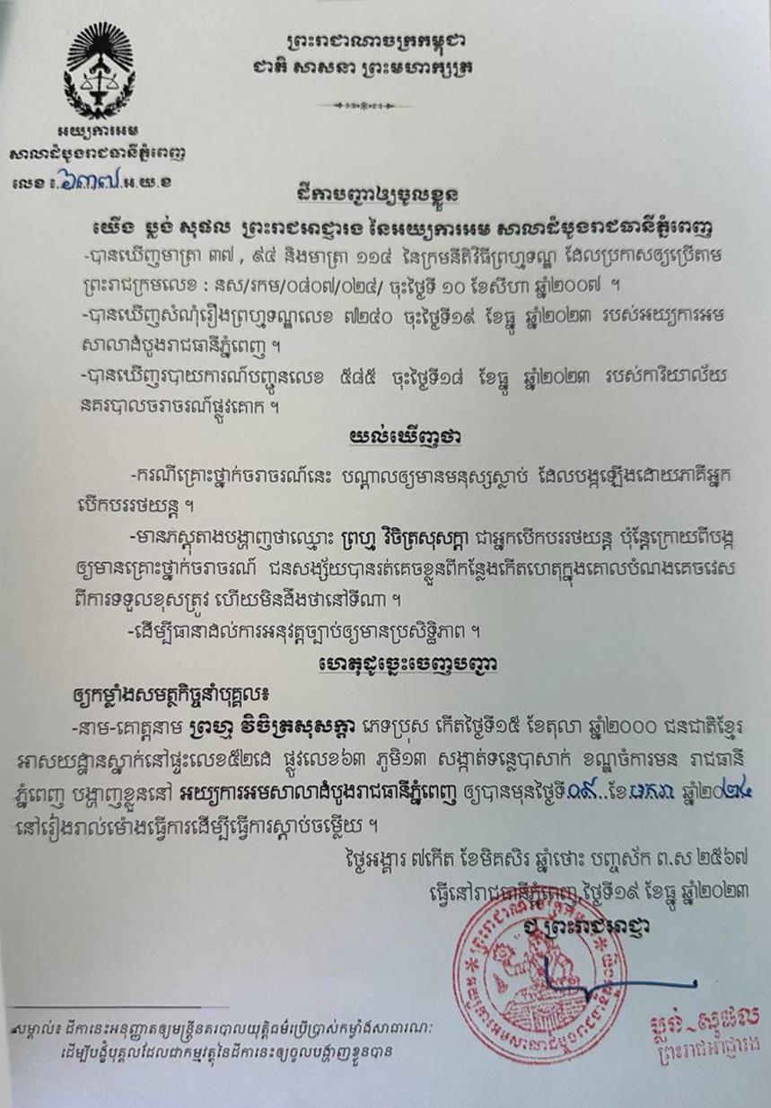 តាមរយៈដីកាដែលបណ្ដាញព័ត៌មាន Fresh News ទទួលបាននៅមុននេះបន្ដិច តំណាងអយ្យការអមសាលាដំបូងរាជធានីភ្នំពេញ បានកំណត់ឲ្យជនបង្កឈ្មោះ ព្រហ្ម វិចិត្រសុសក្ដា អាយុ២៣ឆ្នាំ បង្ហាញខ្លួននៅតុលាការឲ្យបានមុនថ្ងៃទី០៩ ខែមករា ឆ្នាំ២០២៤ នៅរៀងរាល់ម៉ោងធ្វើការ។ ក្នុងដីកាដដែលនេះ ក៏បានកត់សម្គាល់ថា ដីកានេះអនុញ្ញាតឲ្យមន្ដ្រីនគរបាលយុត្តិធម៌ប្រើប្រាស់កម្លាំងសាធារណៈ ដើម្បីបង្ខំឲ្យបុគ្គល ព្រហ្ម វិចិត្រសុសក្ដា ចូលបង្ហាញខ្លួនបាន។