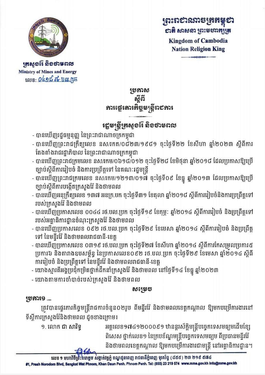 សូមរំលឹកថា រដ្ឋមន្រ្តីក្រសួងរ៉ែ និងថាមពល លោក កែវ រតន: នាថ្ងៃទី២១ ខែធ្នូ ឆ្នាំ២០២៣ បានចេញសេចក្តីប្រកាស ផ្ទេភារកិច្ចមន្ត្រីរាជការ២រូប ម្នាក់ជាប្រធានមន្ទីររ៉ែ និងថាមពល ហើយម្នាក់ទៀតជាប្រធានការិយាល័យរ៉ែ និងថាមពលខេត្តកណ្តាល ឲ្យមកជាមន្រ្តីបម្រើការងារនៅទីស្តីការក្រសួង។