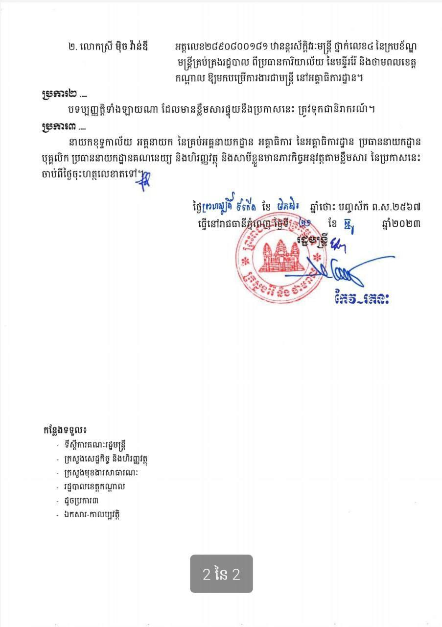 រដ្ឋមន្ដ្រី កែវ រតនៈ ចេញលិខិតបង្គាប់ចាត់តាំងប្រធានមន្ទីររ៉ែខេត្តត្បូងឃ្មុំ មកជាប្រធានស្ដីពីមន្ទីររ៉ែខេត្តកណ្ដាល ក្រោយប្រធានមន្ទីរចាស់ត្រូវបានដកតំណែង