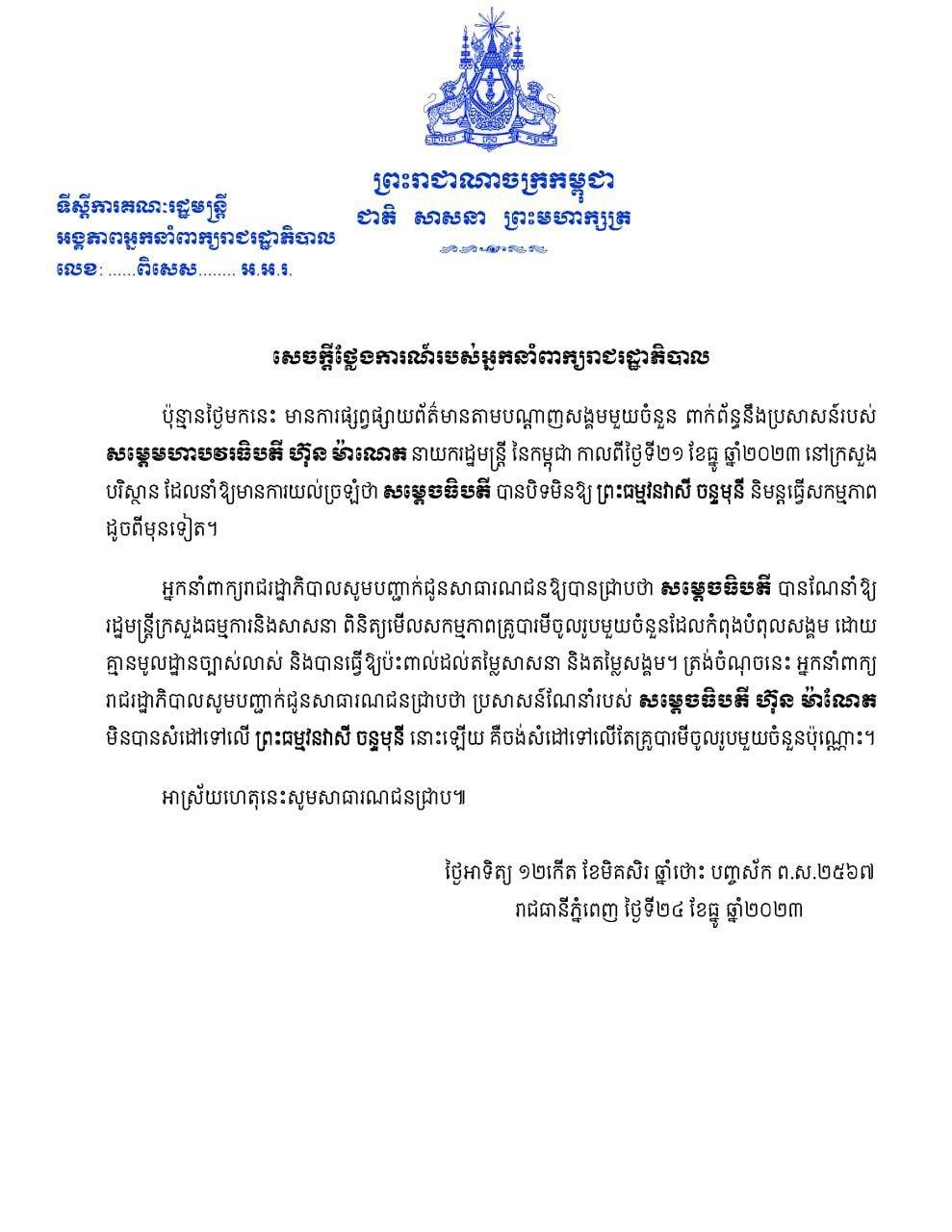 (ភ្នំពេញ)៖ នៅព្រឹកថ្ងៃទី២៤ ខែធ្នូ ឆ្នាំ២០២៣នេះ អ្នកនាំពាក្យរាជរដ្ឋាភិបាលកម្ពុជា បានចេញសេចក្តីថ្លែងការណ៍មួយដោយបញ្ជាក់យ៉ាងច្បាស់ថា ប្រសាសន៍ណែនាំរបស់សម្តេចធិបតី ហ៊ុន ម៉ាណែត ឲ្យក្រសួងធម្មការ និងសាសនា ពិនិត្យមើលសកម្មភាពគ្រូចូលរូបមួយចំនួន គឺមិនបានសំដៅទៅលើព្រះអង្គចន្ទមុនីនោះឡើយ។